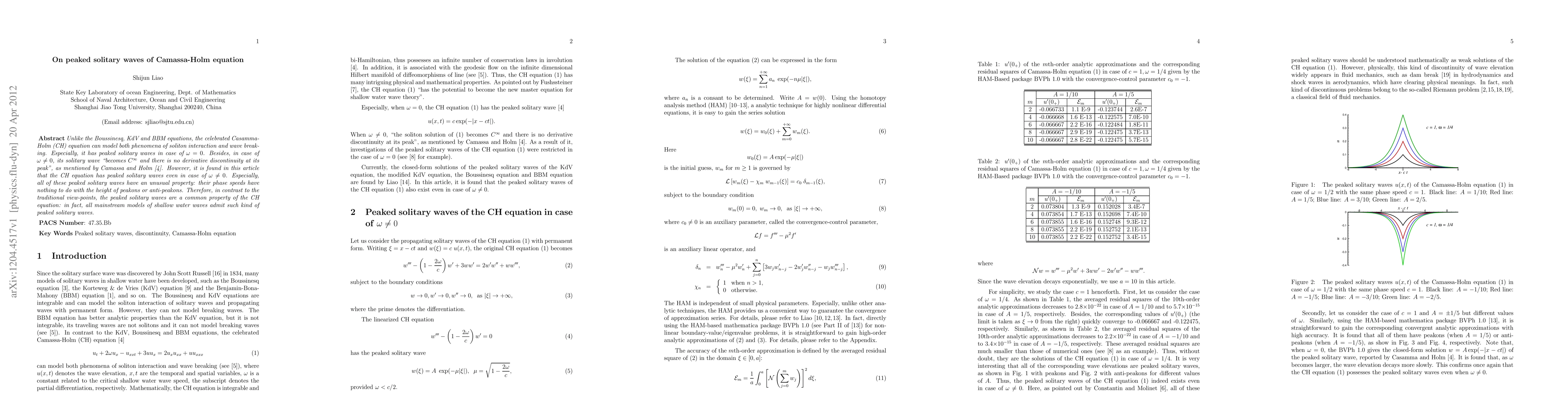 Unlike the Boussinesq, KdV and BBM equations, the celebrated Casamma-Holm (CH) equation can model both phenomena of soliton interaction and wave breaking. Especially, it has peaked solitary waves in case of omega=0. Besides, in case of omega > 0, its solitary wave "becomes $C^\infty$ and there is no derivative discontinuity at its peak", as mentioned by Camassa and Holm in 1993 (PRL). However, it is found in this article that the CH equation has peaked solitary waves even in case of omega > 0. Especially, all of these peaked solitary waves have an unusual property: their phase speeds have nothing to do with the height of peakons or anti-peakons. Therefore, in contrast to the traditional view-points, the peaked solitary waves are a common property of the CH equation: in fact, all mainstream models of shallow water waves admit such kind of peaked solitary waves