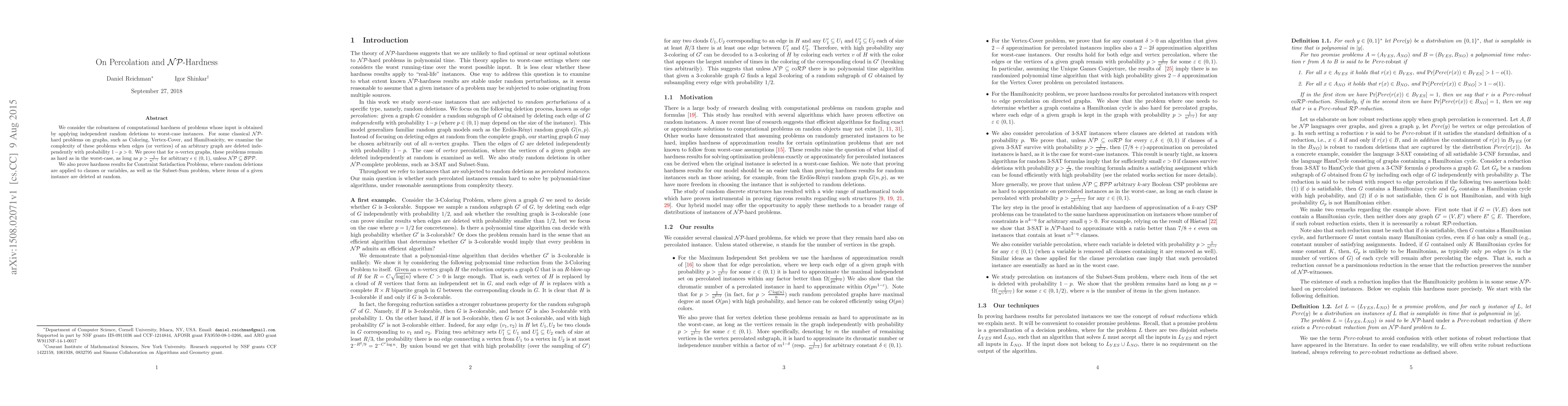 This paper investigates the computational hardness of classical $NP$-hard problems on graphs under random deletions, proving that these problems remain hard unless $NP \subseteq BPP$, even when edges or vertices are deleted independently with a probability threshold. It also extends the findings to Constraint Satisfaction Problems and the Subset-Sum problem.