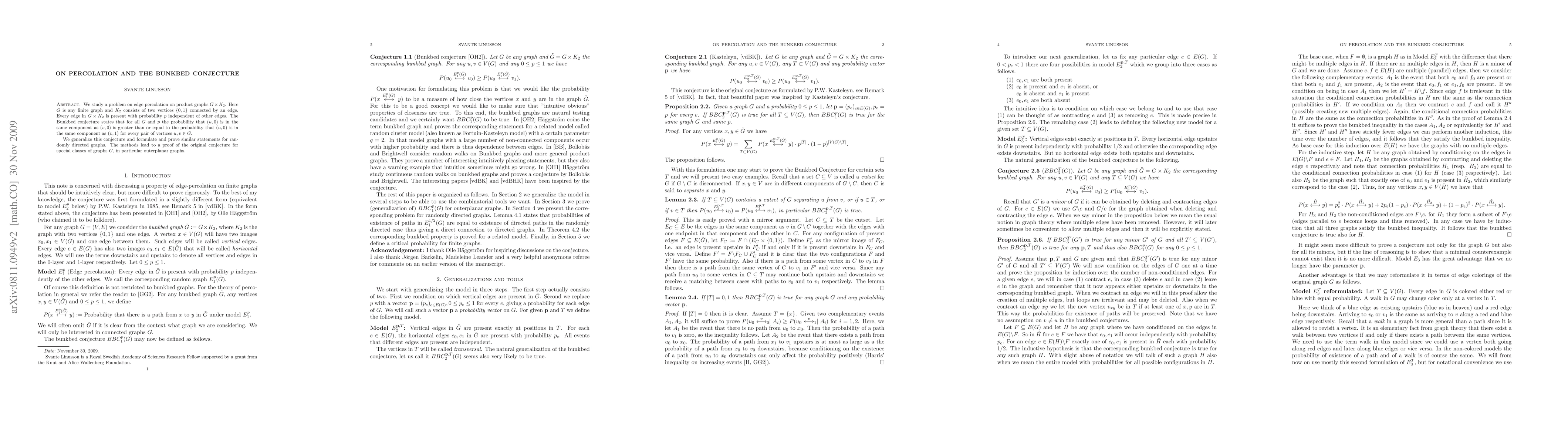We study a problem on edge percolation on product graphs $G\times K_2$. Here $G$ is any finite graph and $K_2$ consists of two vertices $\{0,1\}$ connected by an edge. Every edge in $G\times K_2$ is present with probability $p$ independent of other edges. The Bunkbed conjecture states that for all $G$ and $p$ the probability that $(u,0)$ is in the same component as $(v,0)$ is greater than or equal to the probability that $(u,0)$ is in the same component as $(v,1)$ for every pair of vertices $u,v\in G$. We generalize this conjecture and formulate and prove similar statements for randomly directed graphs. The methods lead to a proof of the original conjecture for special classes of graphs $G$, in particular outerplanar graphs.