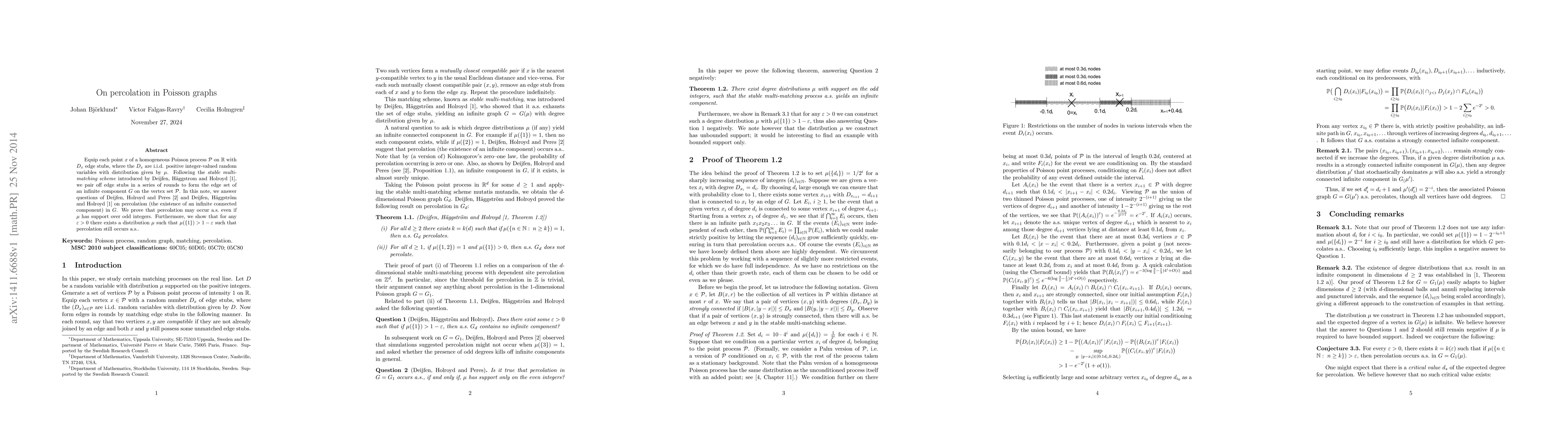 Equip each point $x$ of a homogeneous Poisson process $\mathcal{P}$ on $\mathbb{R}$ with $D_x$ edge stubs, where the $D_x$ are i.i.d. positive integer-valued random variables with distribution given by $\mu$. Following the stable multi-matching scheme introduced by Deijfen, H\"aggstrom and Holroyd (2012), we pair off edge stubs in a series of rounds to form the edge set of an infinite component $G$ on the vertex set $\mathcal{P}$. In this note, we answer questions of Deijfen, Holroyd and Peres (2011) and Deijfen, H\"aggstr\"om and Holroyd (2012) on percolation (the existence of an infinite connected component) in $G$. We prove that percolation may occur a.s. even if $\mu$ has support over odd integers. Furthermore, we show that for any $\varepsilon>0$ there exists a distribution $\mu$ such that $\mu(\{1\})>1-\varepsilon$ such that percolation still occurs a.s..