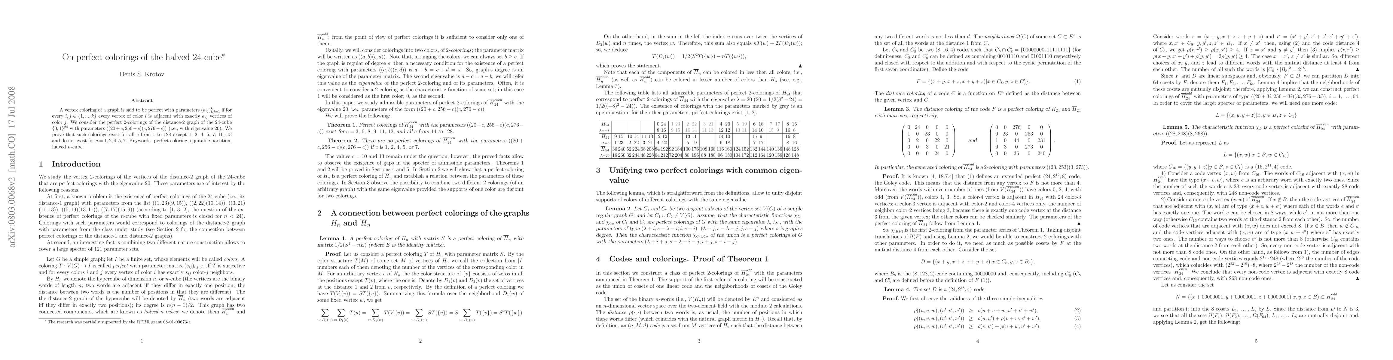 The paper presents a proof of existence and non-existence for specific perfect colorings on the halved 24-cube, utilizing equitable partitions and spectral graph theory.
