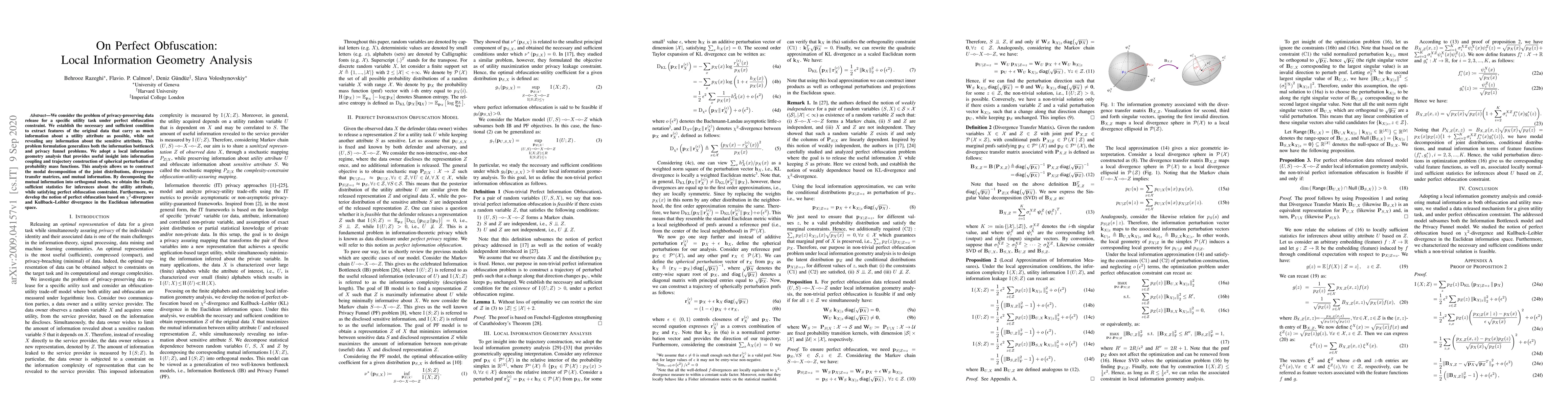 This paper explores privacy-preserving data release under perfect obfuscation, establishing necessary and sufficient conditions for maximizing information about a utility attribute without revealing sensitive data. It employs local information geometry to analyze information coupling and construct divergence transfer matrices, ultimately achieving perfect obfuscation through modal decomposition of joint distributions.