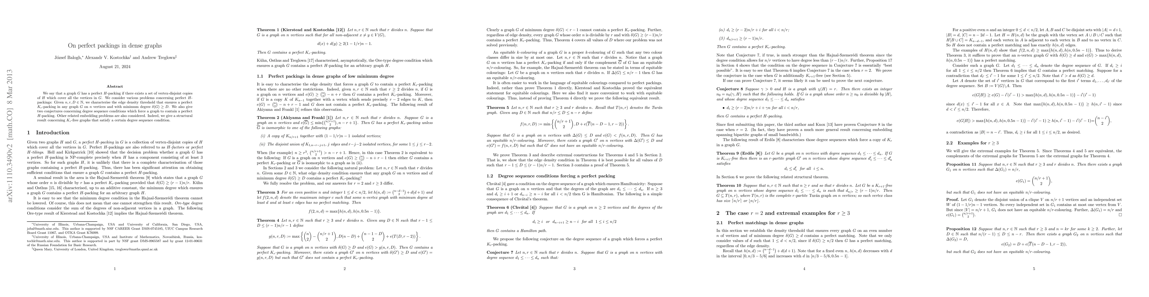 Researchers studied perfect packings in dense graphs, finding an edge density threshold that ensures a perfect K_r-packing in certain graph types. They also proposed degree sequence conditions that force a graph to contain a perfect H-packing.
