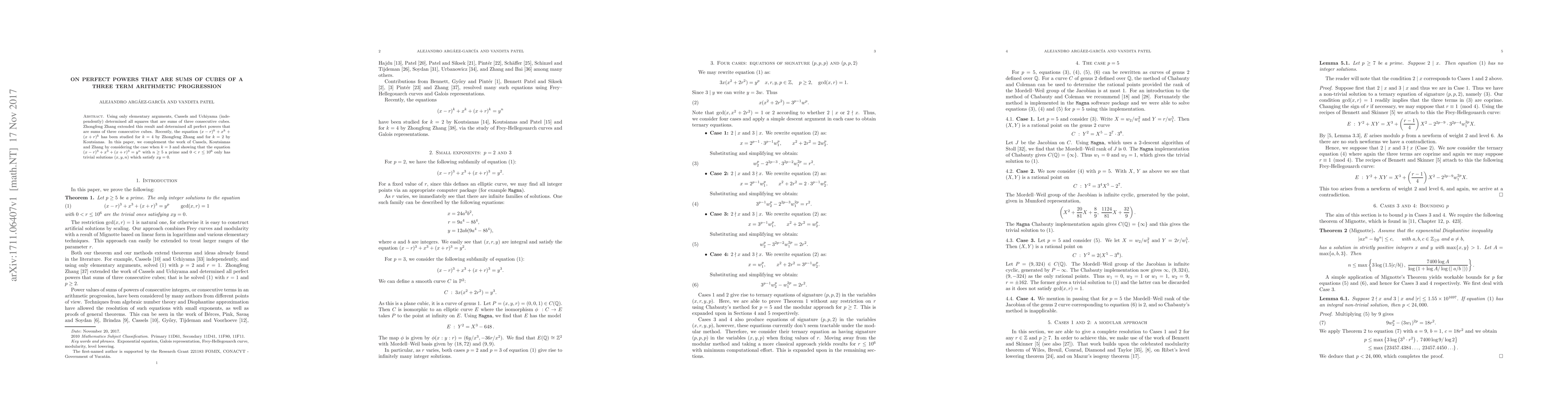 This paper investigates the equation $(x-r)^3+x^3+(x+r)^3=y^n$ for $n\geq 5$ prime, showing it only has trivial solutions $(x,y,n)$ when $0 < r \leq 10^6$. This extends prior work on sums of cubes by Cassels, Uchiyama, and Zhang.