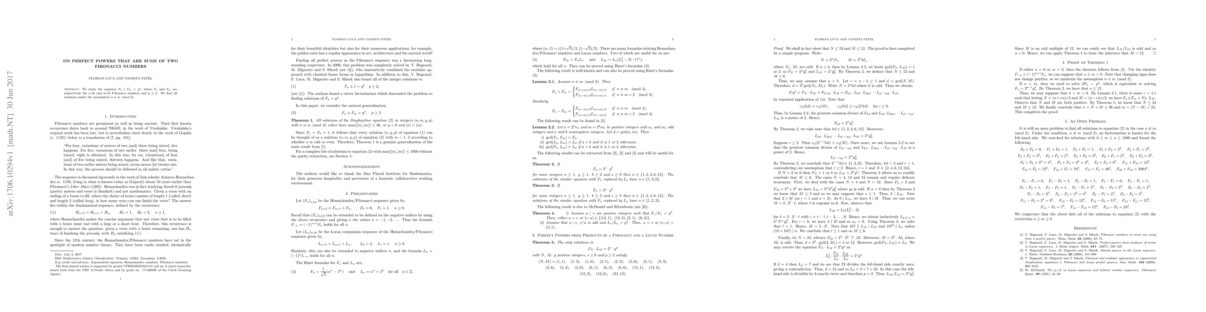 Researchers studied the equation $F_n + F_m = y^p$, finding solutions for perfect powers that are sums of two Fibonacci numbers under the assumption $n ot ightarrow m mod{2}$. The study provides insight into a specific type of mathematical relationship between Fibonacci numbers and powers.