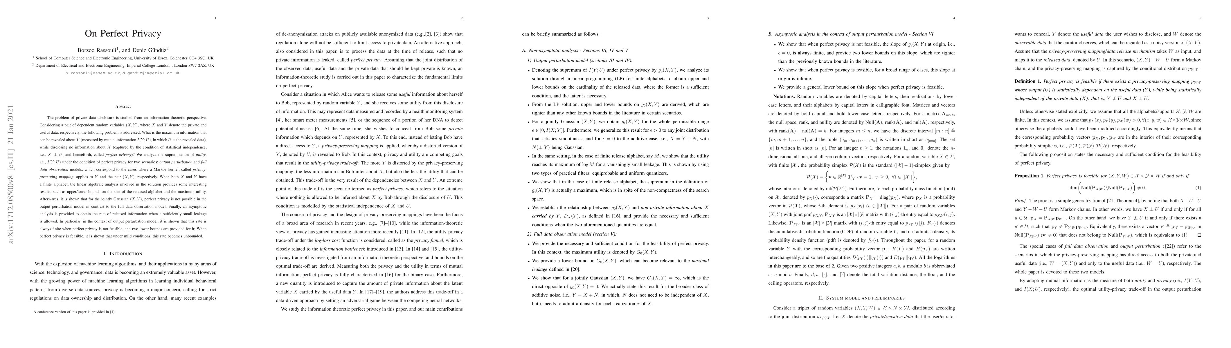 The problem of private data disclosure is studied from an information theoretic perspective. Considering a pair of dependent random variables $(X,Y)$, where $X$ and $Y$ denote the private and useful data, respectively, the following problem is addressed: What is the maximum information that can be revealed about $Y$ (measured by mutual information $I(Y;U)$, in which $U$ is the revealed data), while disclosing no information about $X$ (captured by the condition of statistical independence, i.e., $X\independent U$, and henceforth, called \textit{perfect privacy})? We analyze the supremization of \textit{utility}, i.e., $I(Y;U)$ under the condition of perfect privacy for two scenarios: \textit{output perturbation} and \textit{full data observation} models, which correspond to the cases where a Markov kernel, called \textit{privacy-preserving mapping}, applies to $Y$ and the pair $(X,Y)$, respectively. When both $X$ and $Y$ have a finite alphabet, the linear algebraic analysis involved in the solution provides some interesting results, such as upper/lower bounds on the size of the released alphabet and the maximum utility. Afterwards, it is shown that for the jointly Gaussian $(X,Y)$, perfect privacy is not possible in the output perturbation model in contrast to the full data observation model. Finally, an asymptotic analysis is provided to obtain the rate of released information when a sufficiently small leakage is allowed. In particular, in the context of output perturbation model, it is shown that this rate is always finite when perfect privacy is not feasible, and two lower bounds are provided for it; When perfect privacy is feasible, it is shown that under mild conditions, this rate becomes unbounded.