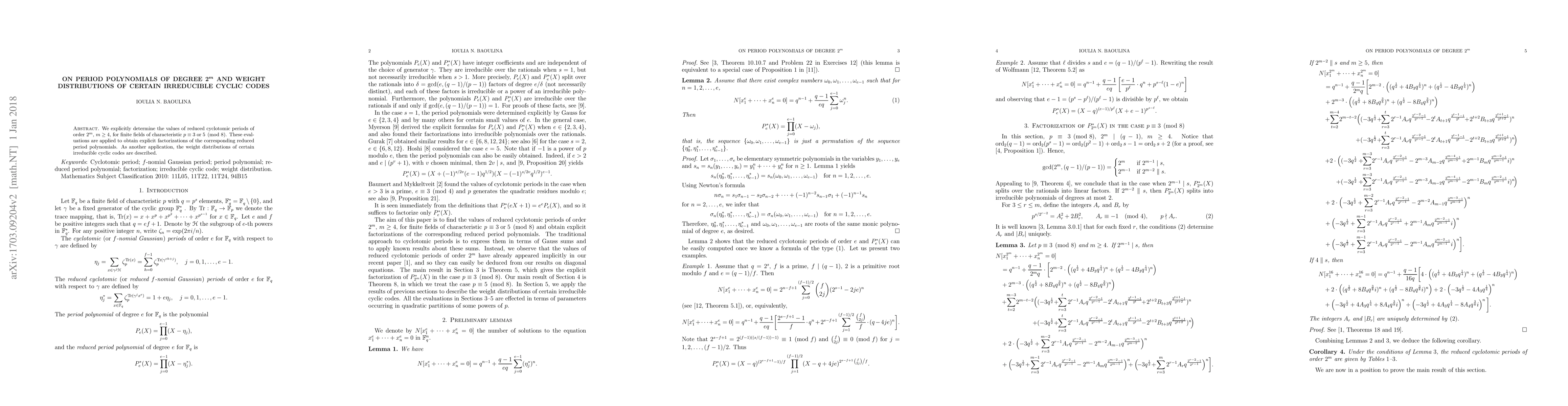 This paper determines the values of reduced cyclotomic periods of order $2^m$ for finite fields of characteristic $p\equiv 3$ or $5\pmod{8}$, and uses these to factorize corresponding period polynomials and describe the weight distributions of specific irreducible cyclic codes.