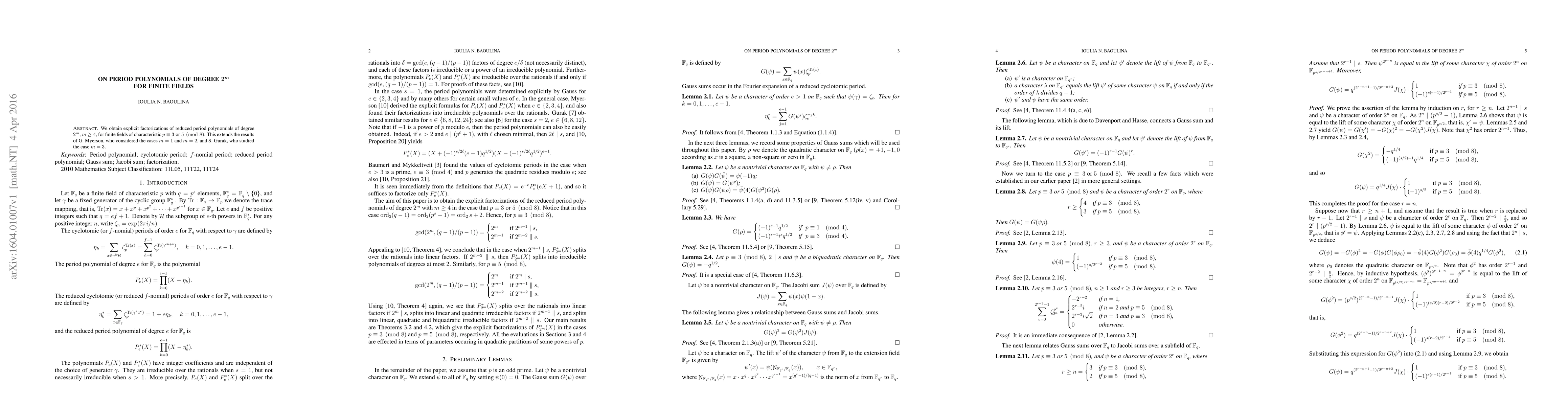 We obtain explicit factorizations of reduced period polynomials of degree $2^m$, $m\ge 4$, for finite fields of characteristic $p\equiv 3$ or $5\pmod{8}$. This extends the results of G. Myerson, who considered the cases $m=1$ and $m=2$, and S. Gurak, who studied the case $m=3$.
