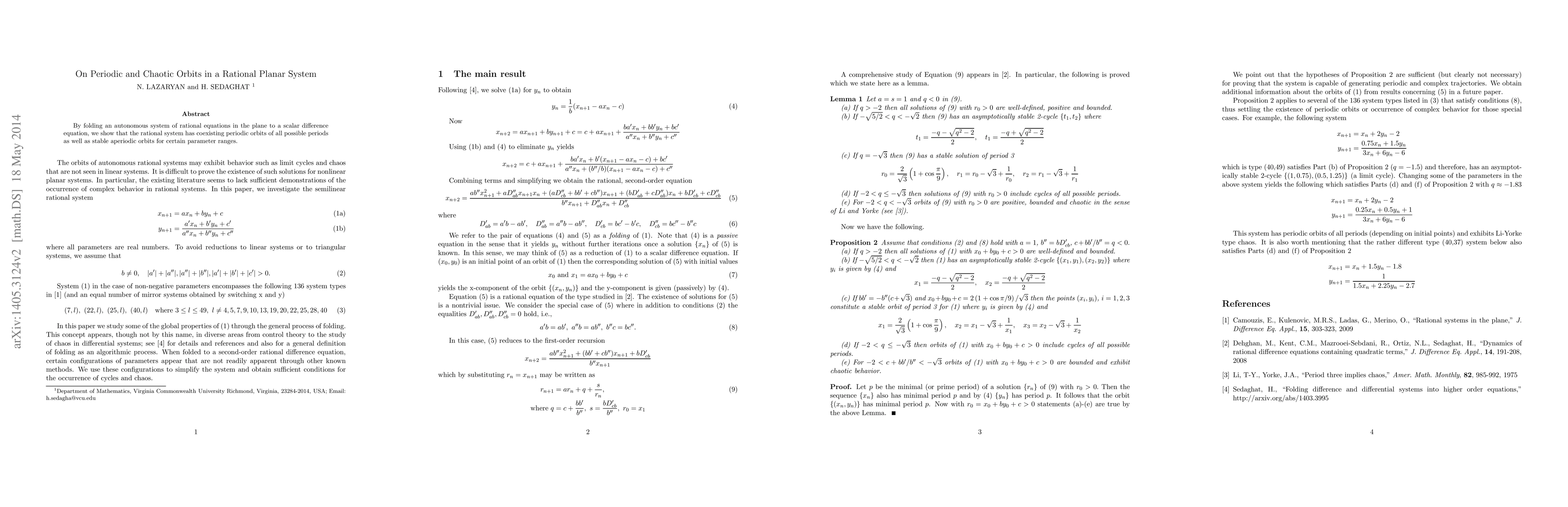 Summary: This paper demonstrates that a rational planar system, when transformed into a scalar difference equation, exhibits both periodic orbits of various lengths and stable chaotic orbits under specific parameter conditions.