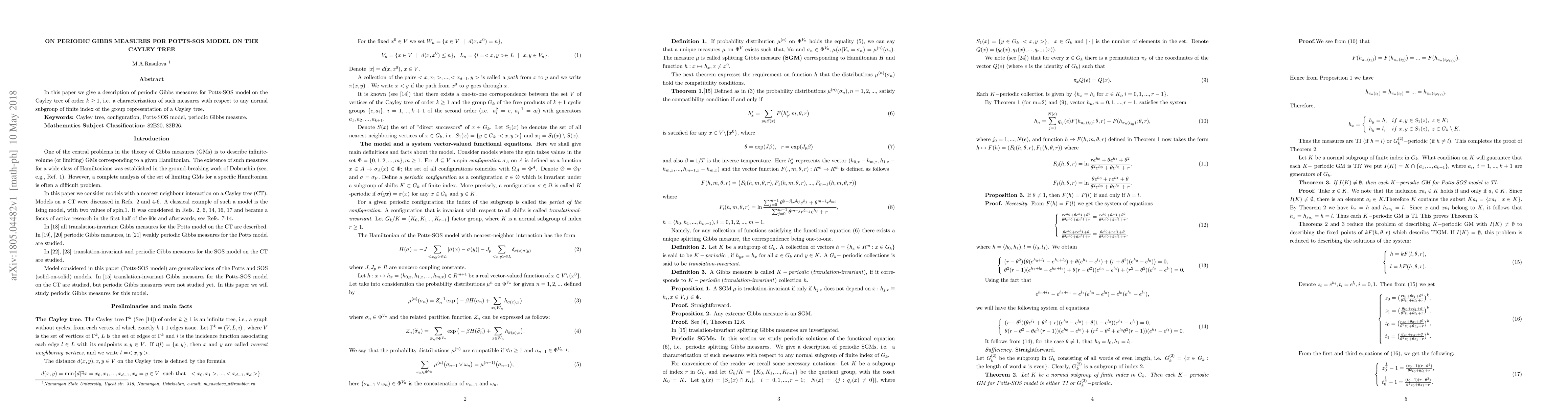 This paper characterizes periodic Gibbs measures for the Potts-SOS model on a Cayley tree of order $k\geq 1$, focusing on measures relative to any normal subgroup of finite index within the group representation of the tree.