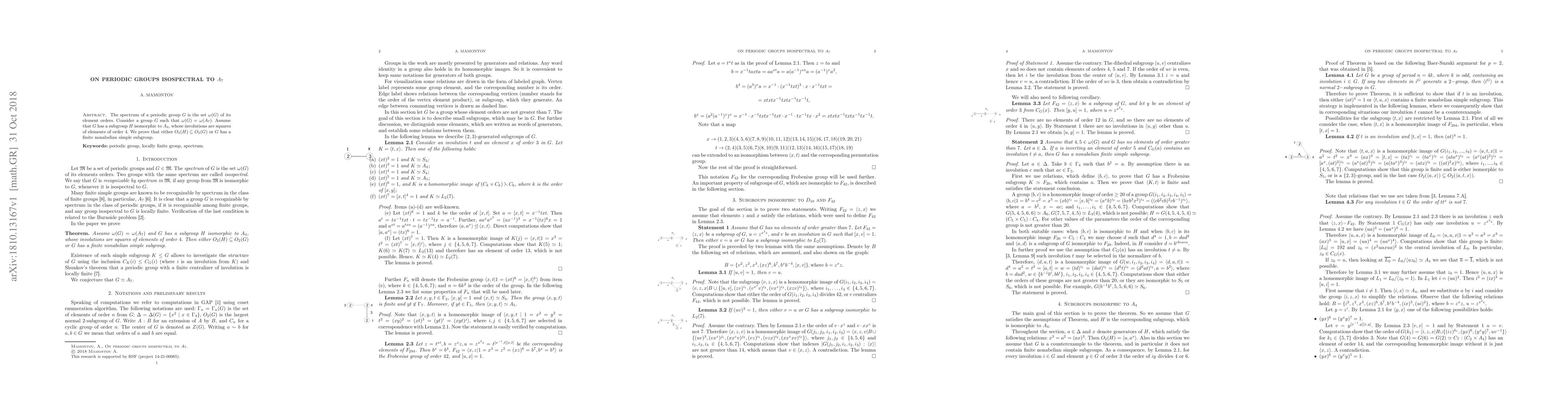 The spectrum of a periodic group $G$ is the set $\omega(G)$ of its element orders. Consider a group $G$ such that $\omega(G)=\omega(A_7)$. Assume that $G$ has a subgroup $H$ isomorphic to $A_4$, whose involutions are squares of elements of order $4$. We prove that either $O_2(H) \subseteq O_2(G)$ or $G$ has a finite nonabelian simple subgroup.