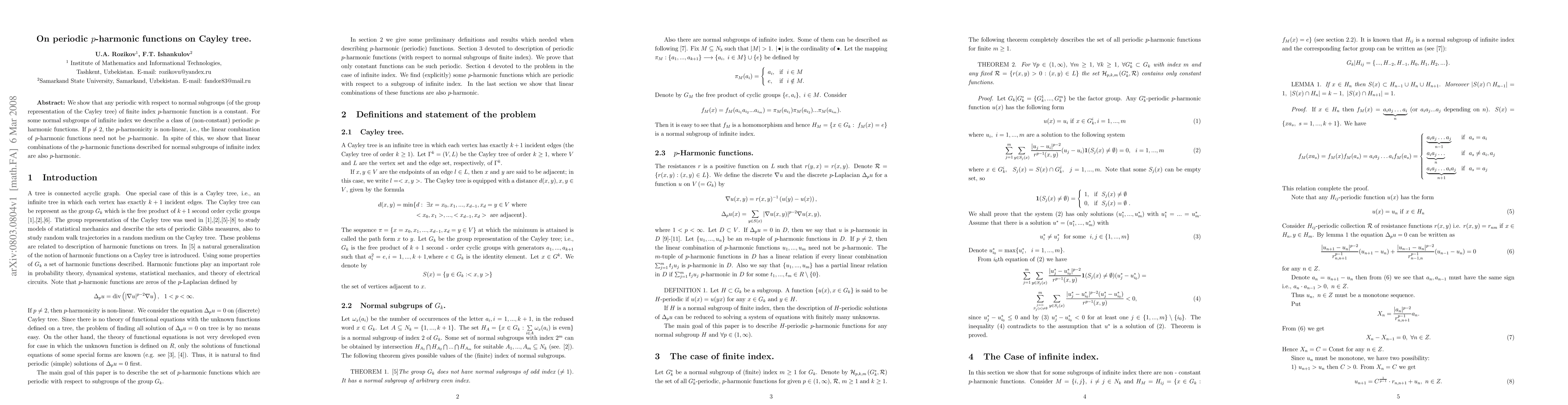 We show that any periodic with respect to normal subgroups (of the group representation of the Cayley tree) of finite index $p$-harmonic function is a constant. For some normal subgroups of infinite index we describe a class of (non-constant) periodic $p$-harmonic functions. If $p\neq2$, the $p$-harmonicity is non-linear, i.e., the linear combination of $p$-harmonic functions need not be $p$-harmonic. In spite of this, we show that linear combinations of the $p$-harmonic functions described for normal subgroups of infinite index are also $p$-harmonic.