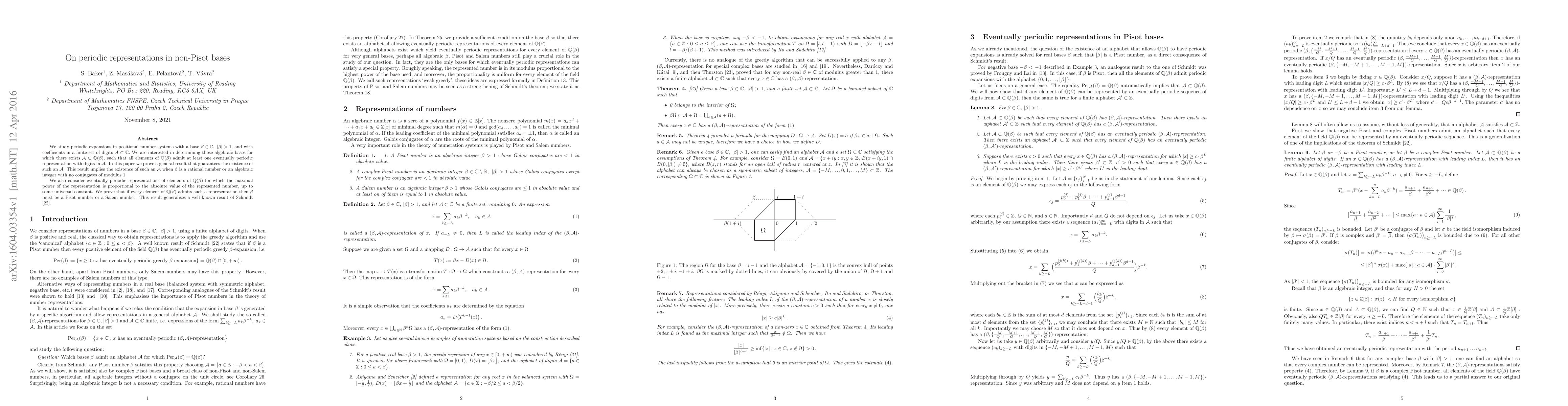 The paper proves that for a certain algebraic base, all elements in its field of expansion can have at least one eventually periodic representation with digits from a specific set. It also shows that if every element has such a representation with maximal power proportional to the number's absolute value, then the base must be a Pisot or Salem number.
