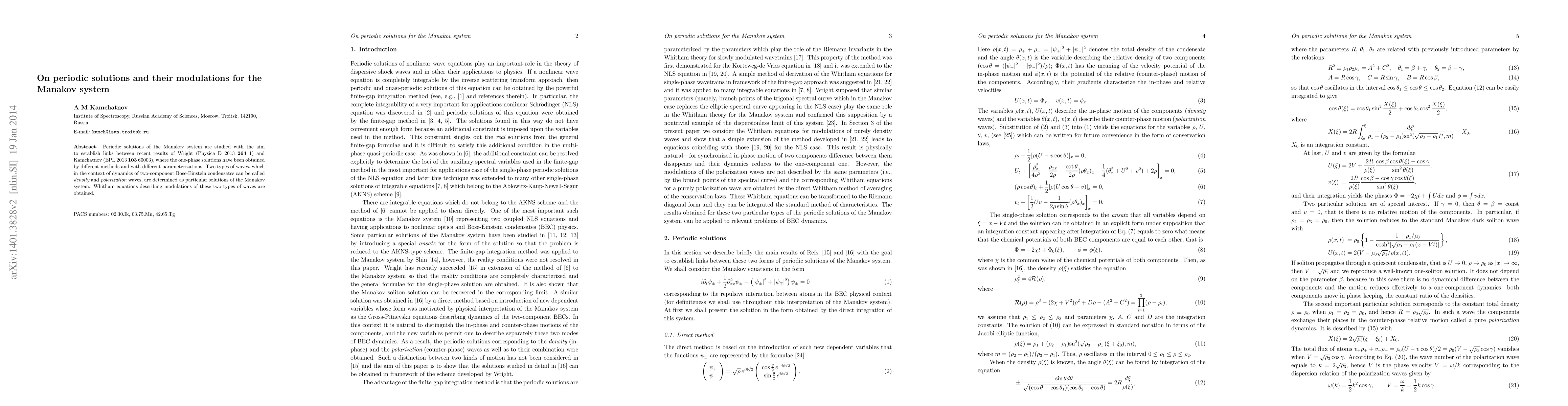 Periodic solutions of the Manakov system are studied with the aim to establish links between recent results of Wright (Physica D 2013 {\bf 264} 1) and Kamchatnov (EPL 2013 \textbf{103} 60003), where the one-phase solutions have been obtained by different methods and with different parameterizations. Two types of waves, which in the context of dynamics of two-component Bose-Einstein condensates can be called {\it density} and {\it polarization} waves, are determined as particular solutions of the Manakov system. Whitham equations describing modulations of these two types of waves are obtained.