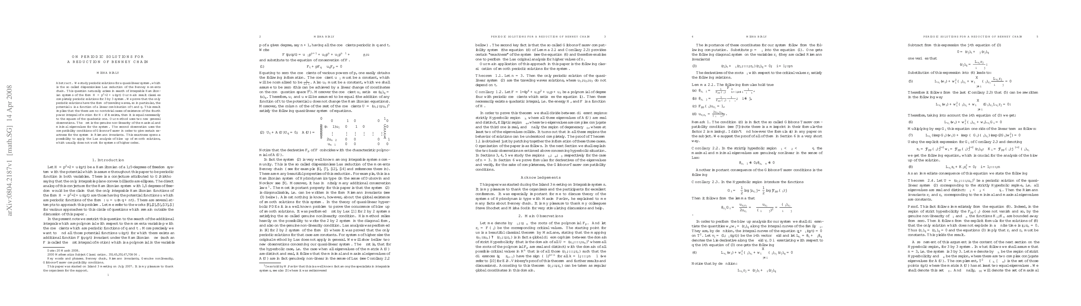 We study periodic solutions for a quasi-linear system, which is the so called dispersionless Lax reduction of the Benney moments chain. This question naturally arises in search of integrable Hamiltonian systems of the form $ H=p^2/2+u(q,t) $ Our main result classifies completely periodic solutions for 3 by 3 system. We prove that the only periodic solutions have the form of traveling waves, so in particular, the potential $u$ is a function of a linear combination of $t$ and $q$. This result implies that the there are no nontrivial cases of existence of the fourth power integral of motion for $H$: if it exists, then it is equal necessarily to the square of the quadratic one. Our method uses two new general observations. The first is the genuine non-linearity of the maximal and minimal eigenvalues for the system. The second observation uses the compatibility conditions of Gibonns-Tsarev in order to give certain exactness for the system in Riemann invariants. This exactness opens a possibility to apply the Lax analysis of blow up of smooth solutions, which usually does not work for systems of higher order.