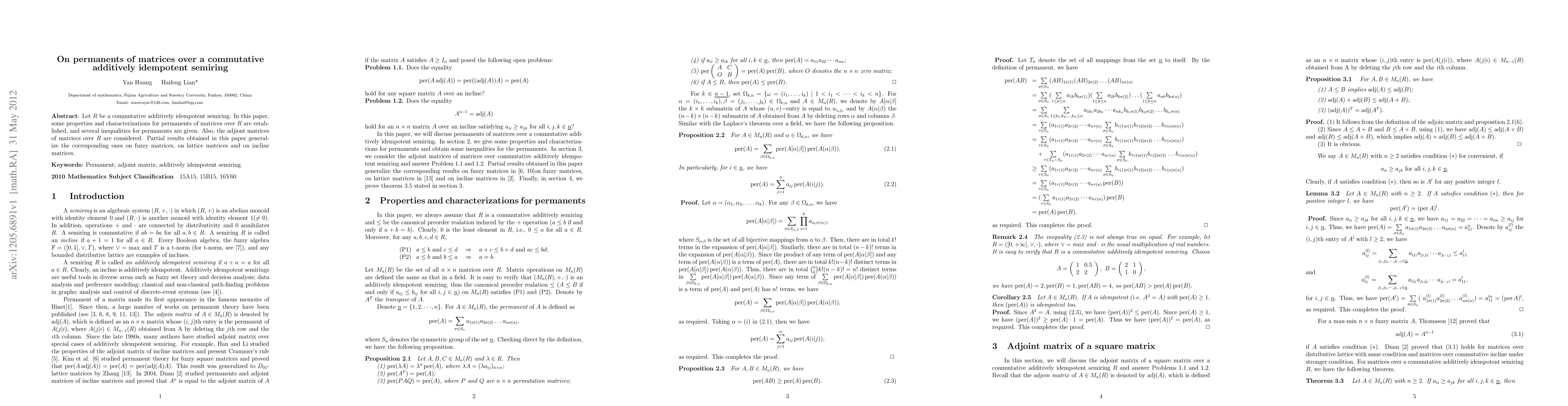 Let $R$ be a commutative additively idempotent semiring. In this paper, some properties and characterizations for permanents of matrices over $R$ are established, and several inequalities for permanents are given. Also, the adjiont matrices of matriecs over $R$ are considered. Partial results obtained in this paper generalize the corresponding ones on fuzzy matrices, on lattice matrices and on incline matrices.