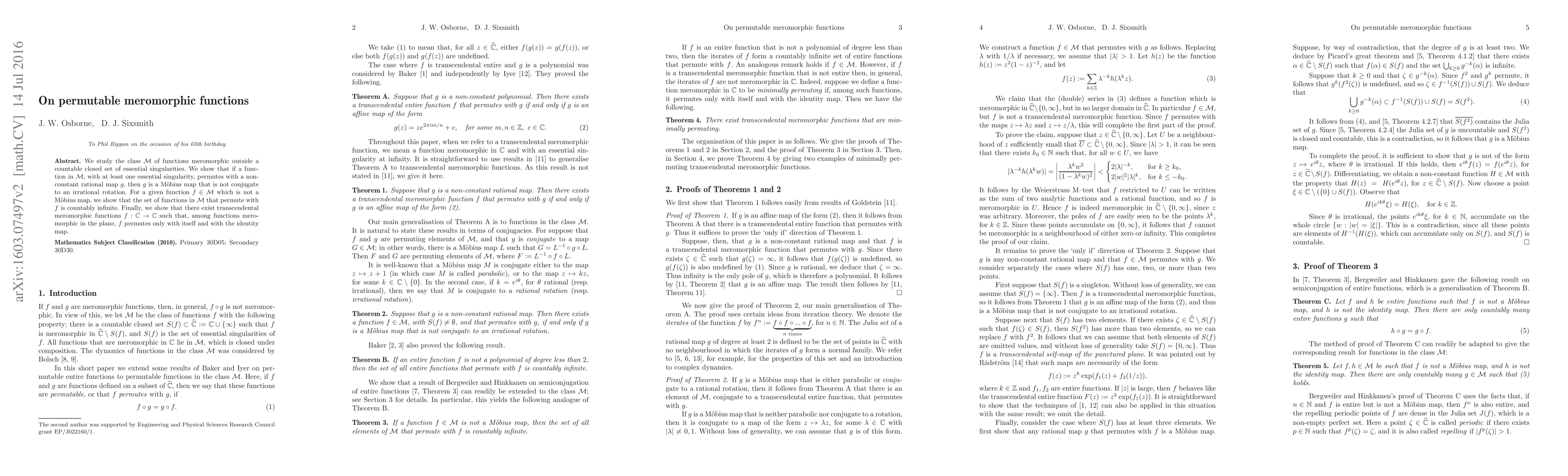 This paper investigates permutable meromorphic functions outside countable closed sets of essential singularities. It demonstrates that if such a function permutes with a non-constant rational map, the map must be a Möbius transformation not conjugate to an irrational rotation. Additionally, it proves that for non-Möbius functions in the class, the set of permuting functions is countably infinite, and identifies transcendental meromorphic functions that permute only with themselves and the identity map.