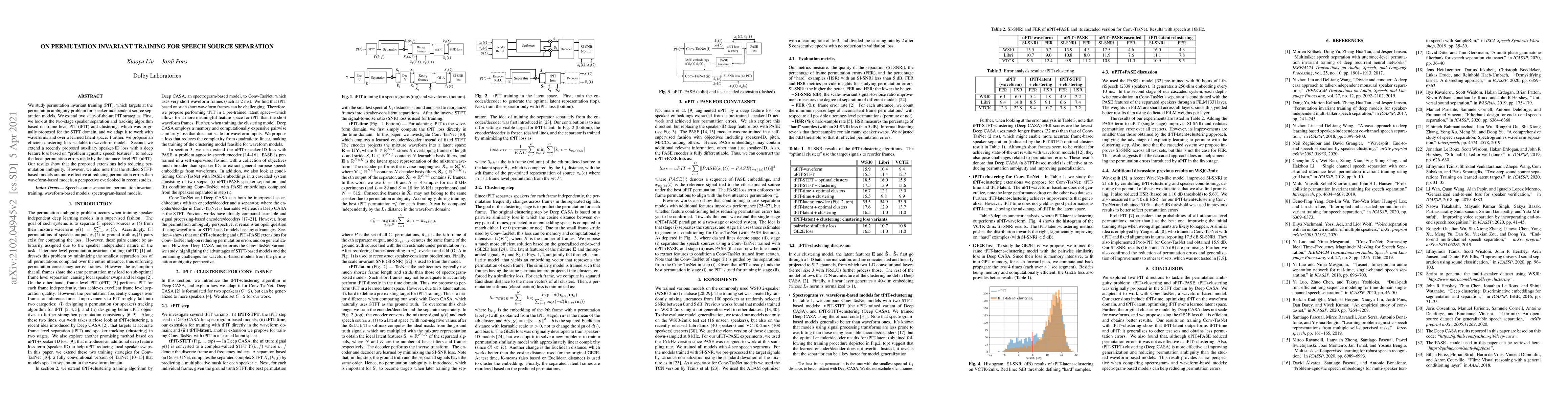 This paper explores permutation invariant training (PIT) to address permutation ambiguity in speaker independent source separation. It extends two PIT strategies: a two-stage frame-level PIT and clustering adapted for waveforms, and an auxiliary speaker-ID loss with deep feature loss. Results show reduced permutation errors, though STFT-based models remain more effective than waveform-based ones.