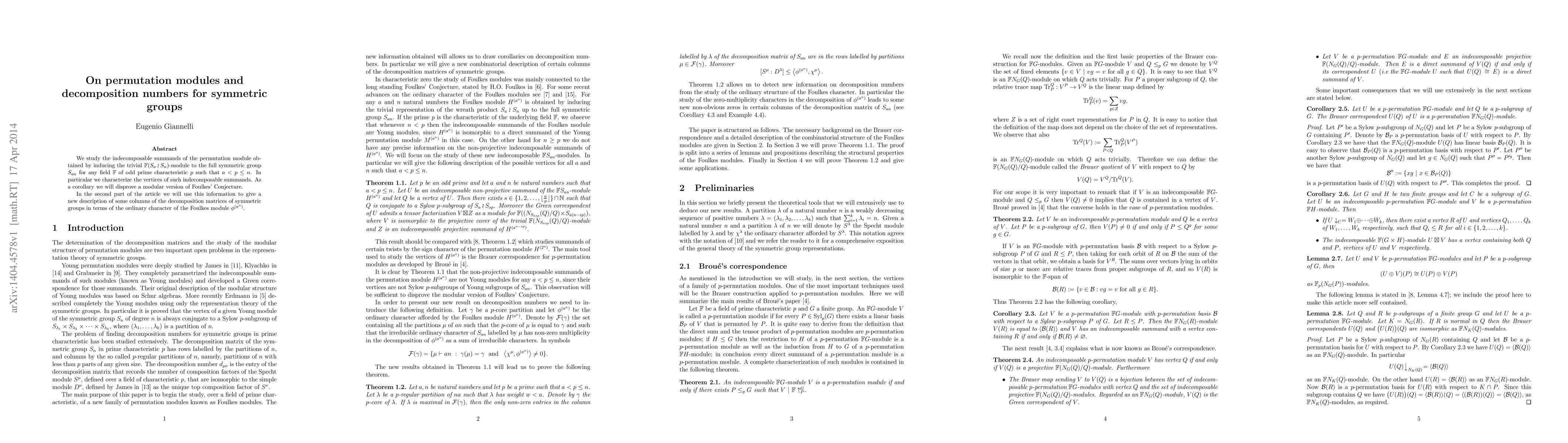 This paper investigates permutation modules from inducing trivial $mathbb{F}(S_awr S_n)$-modules to $S_{an}$, characterizing indecomposable summands' vertices for odd prime characteristic $p$ where $a<pleq n$. It disproves a modular version of Foulkes' Conjecture and provides a novel description of decomposition matrix columns using Foulkes modules $phi^{(a^n)}$.