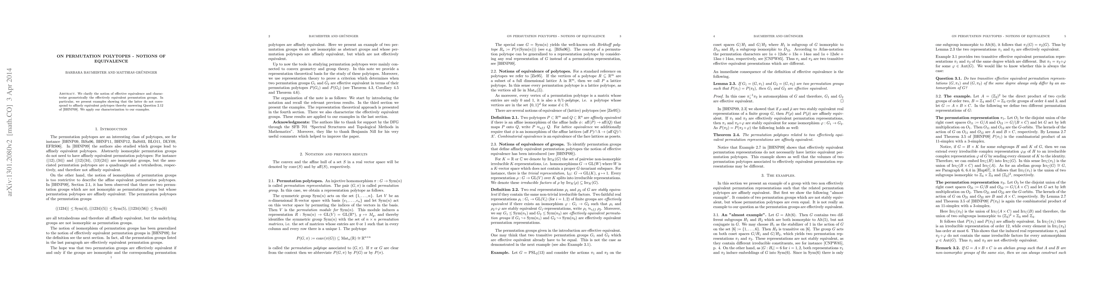 This paper clarifies the concept of effective equivalence among permutation groups and geometrically characterizes effectively equivalent groups. It demonstrates that these groups do not necessarily correspond to affinely equivalent polytopes, addressing and answering Question 2.12 from [BHNP09].
