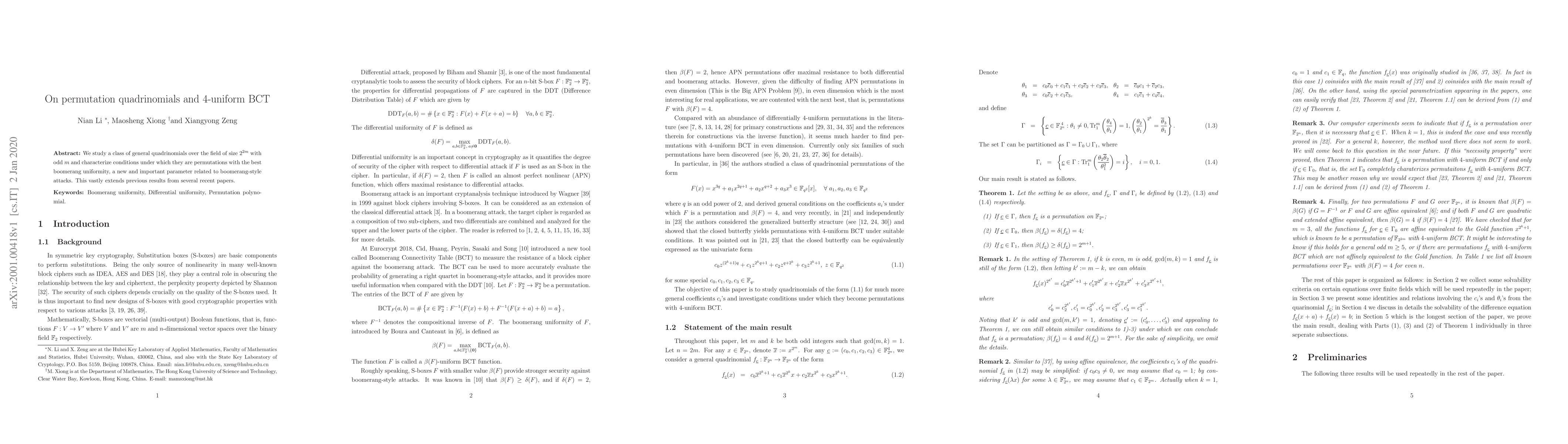 The paper presents detailed characterizations and proofs related to permutation quadrinomials and their boomerang uniformity, contributing to the theoretical understanding of algebraic structures in cryptography.