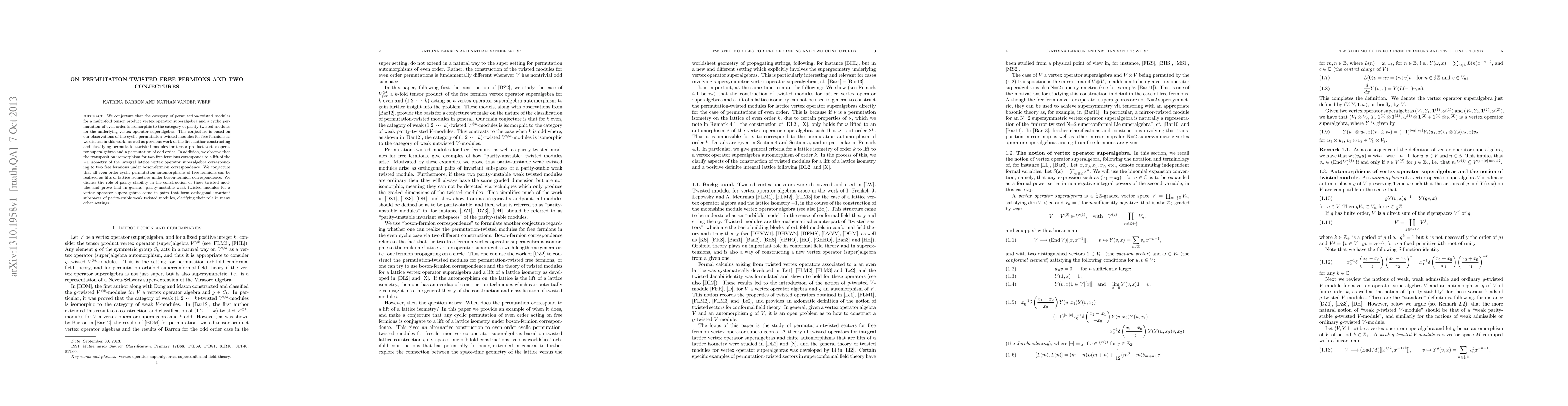 We conjecture that the category of permutation-twisted modules for a multi-fold tensor product vertex operator superalgebra and a cyclic permutation of even order is isomorphic to the category of parity-twisted modules for the underlying vertex operator superalgebra. This conjecture is based on our observations of the cyclic permutation-twisted modules for free fermions as we discuss in this work, as well as previous work of the first author constructing and classifying permutation-twisted modules for tensor product vertex operator superalgebras and a permutation of odd order. In addition, we observe that the transposition isomorphism for two free fermions corresponds to a lift of the -1 isometry of the integral lattice vertex operator superalgebra corresponding to two free fermions under boson-fermion correspondence. We conjecture that all even order cyclic permutation automorphisms of free fermions can be realized as lifts of lattice isometries under boson-fermion correspondence. We discuss the role of parity stability in the construction of these twisted modules and prove that in general, parity-unstable weak twisted modules for a vertex operator superalgebras come in pairs that form orthogonal invariant subspaces of parity-stable weak twisted modules, clarifying their role in many other settings.