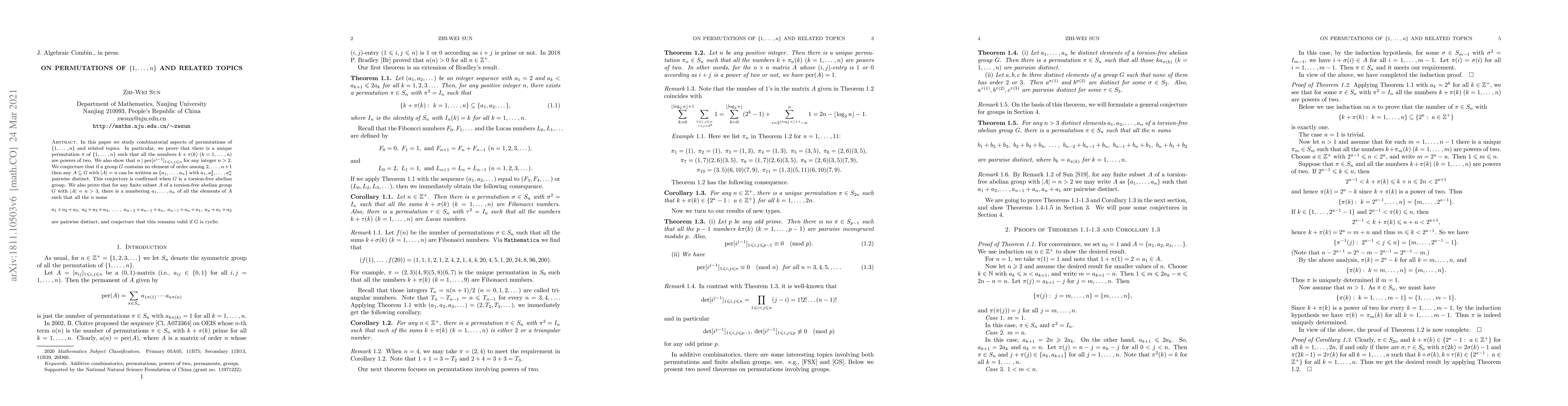 In this paper we study combinatorial aspects of permutations of $\{1,\ldots,n\}$ and related topics. In particular, we prove that there is a unique permutation $\pi$ of $\{1,\ldots,n\}$ such that all the numbers $k+\pi(k)$ ($k=1,\ldots,n$) are powers of two. We also show that $n\mid\text{per}[i^{j-1}]_{1\le i,j\le n}$ for any integer $n>2$. We conjecture that if a group $G$ contains no element of order among $2,\ldots,n+1$ then any $A\subseteq G$ with $|A|=n$ can be written as $\{a_1,\ldots,a_n\}$ with $a_1,a_2^2,\ldots,a_n^n$ pairwise distinct. This conjecture is confirmed when $G$ is a torsion-free abelian group. We also prove that for any finite subset $A$ of a torsion-free abelian group $G$ with $|A|=n>3$, there is a numbering $a_1,\ldots,a_n$ of all the elements of $A$ such that all the $n$ sums $$a_1+a_2+a_3,\ a_2+a_3+a_4,\ \ldots,\ a_{n-2}+a_{n-1}+a_n,\ a_{n-1}+a_n+a_1,\ a_n+a_1+a_2$$ are pairwise distinct.