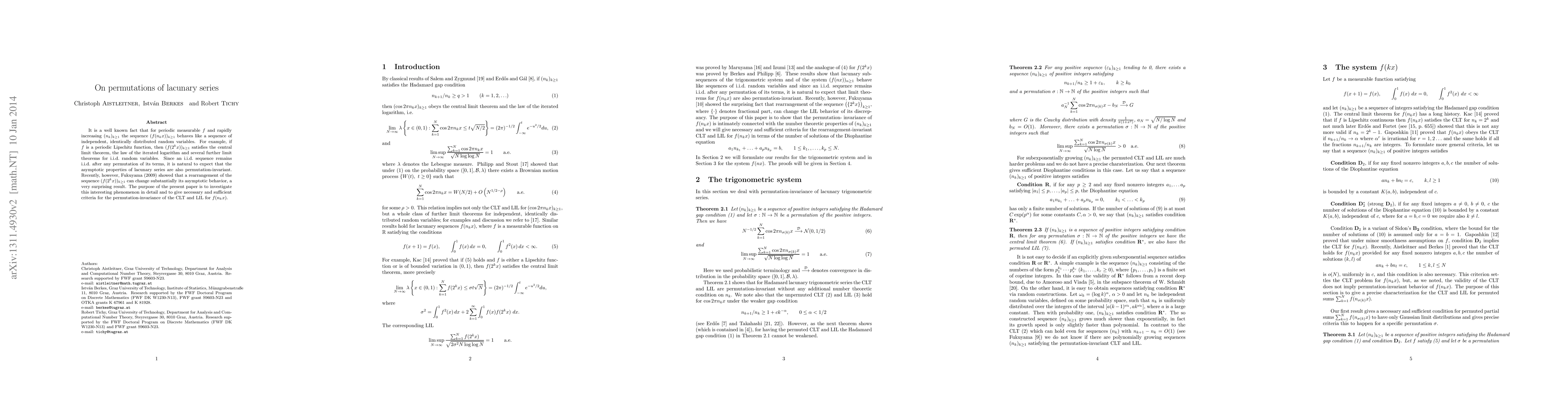 It is a well known fact that for periodic measurable $f$ and rapidly increasing $(n_k)_{k \geq 1}$ the sequence $(f(n_kx))_{k\ge 1}$ behaves like a sequence of independent, identically distributed random variables. For example, if $f$ is a periodic Lipschitz function, then $(f(2^kx))_{k\ge 1}$ satisfies the central limit theorem, the law of the iterated logarithm and several further limit theorems for i.i.d.\ random variables. Since an i.i.d.\ sequence remains i.i.d.\ after any permutation of its terms, it is natural to expect that the asymptotic properties of lacunary series are also permutation-invariant. Recently, however, Fukuyama (2009) showed that a rearrangement of the sequence $(f(2^kx))_{k\ge 1}$ can change substantially its asymptotic behavior, a very surprising result. The purpose of the present paper is to investigate this interesting phenomenon in detail and to give necessary and sufficient criteria for the permutation-invariance of the CLT and LIL for $f(n_kx)$.