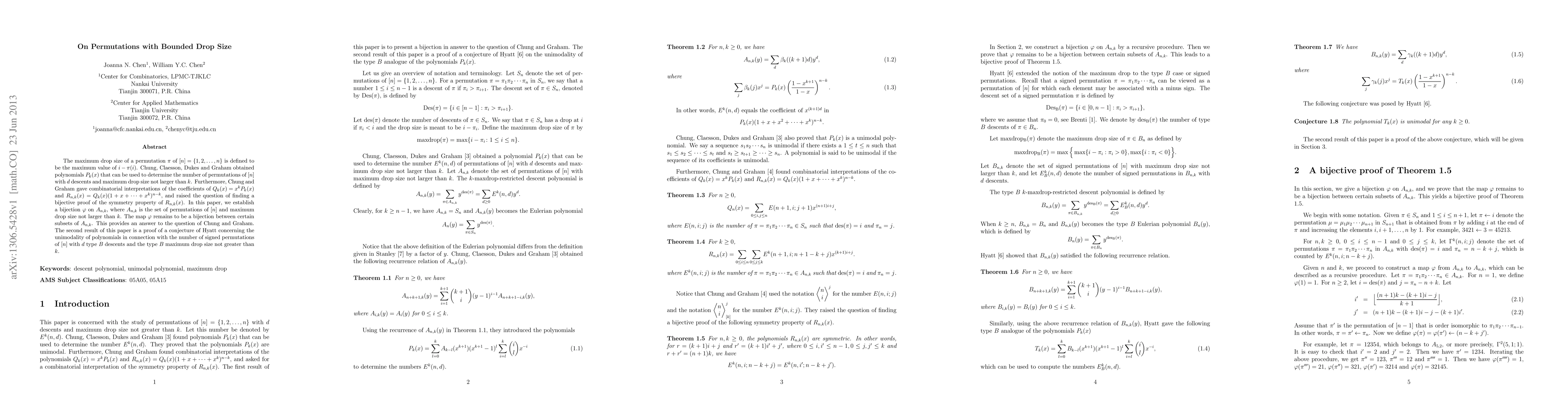 The maximum drop size of a permutation $\pi$ of $[n]=\{1,2,\ldots, n\}$ is defined to be the maximum value of $i-\pi(i)$. Chung, Claesson, Dukes and Graham obtained polynomials $P_k(x)$ that can be used to determine the number of permutations of $[n]$ with $d$ descents and maximum drop size not larger than $k$. Furthermore, Chung and Graham gave combinatorial interpretations of the coefficients of $Q_k(x)=x^k P_k(x)$ and $R_{n,k}(x)=Q_k(x)(1+x+\cdots+x^k)^{n-k}$, and raised the question of finding a bijective proof of the symmetry property of $R_{n,k}(x)$. In this paper, we establish a bijection $\varphi$ on $A_{n,k}$, where $A_{n,k}$ is the set of permutations of $[n]$ and maximum drop size not larger than $k$. The map $\varphi$ remains to be a bijection between certain subsets of $A_{n,k}$. %related to the symmetry property. This provides an answer to the question of Chung and Graham. The second result of this paper is a proof of a conjecture of Hyatt concerning the unimodality of polynomials in connection with the number of signed permutations of $[n]$ with $d$ type $B$ descents and the type $B$ maximum drop size not greater than $k$.
