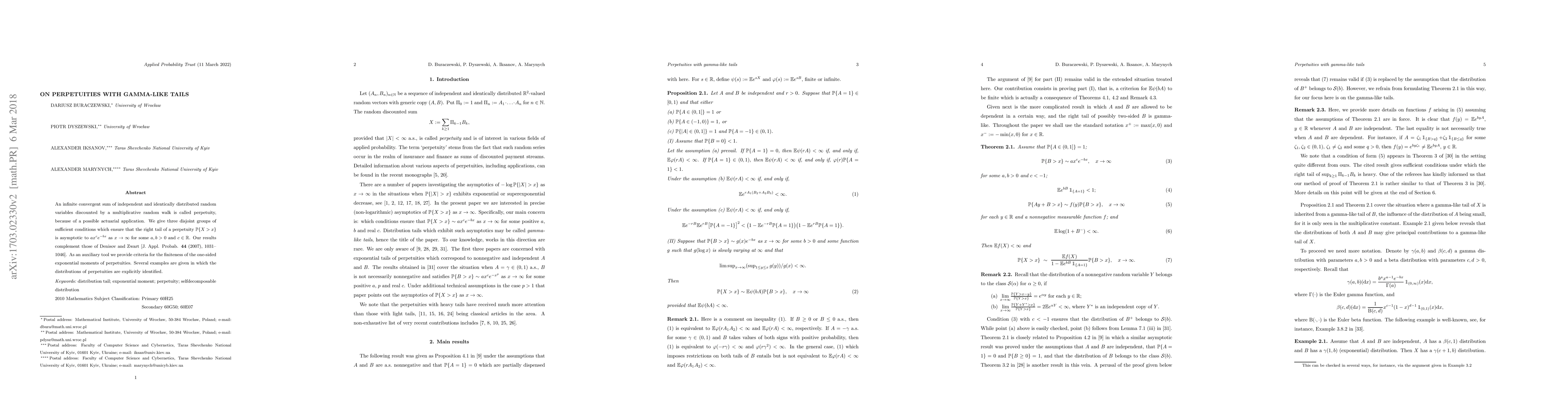This paper explores perpetuities, defined as infinite sums of discounted random variables, and provides three sets of conditions ensuring their distribution right tail asymptotically follows a specified form. It also offers criteria for the finiteness of their exponential moments and includes examples identifying the distributions of perpetuities.