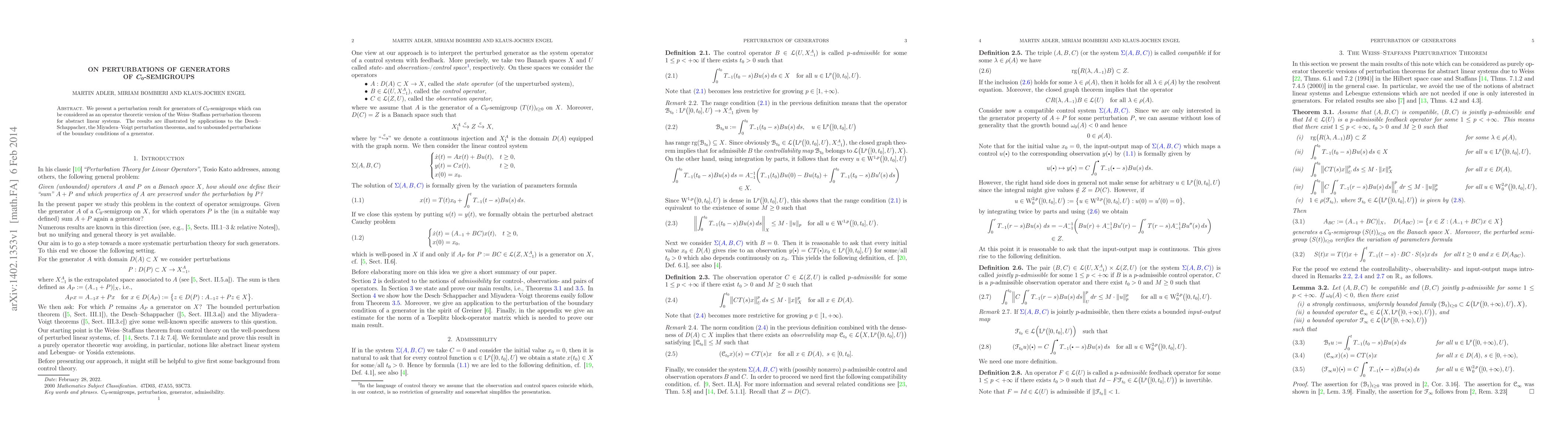 This paper establishes a perturbation result for generators of $C_0$-semigroups, analogous to the Weiss-Staffans theorem, and demonstrates its application to Desch-Schappacher, Miyadera Voigt theorems, and boundary condition perturbations.
