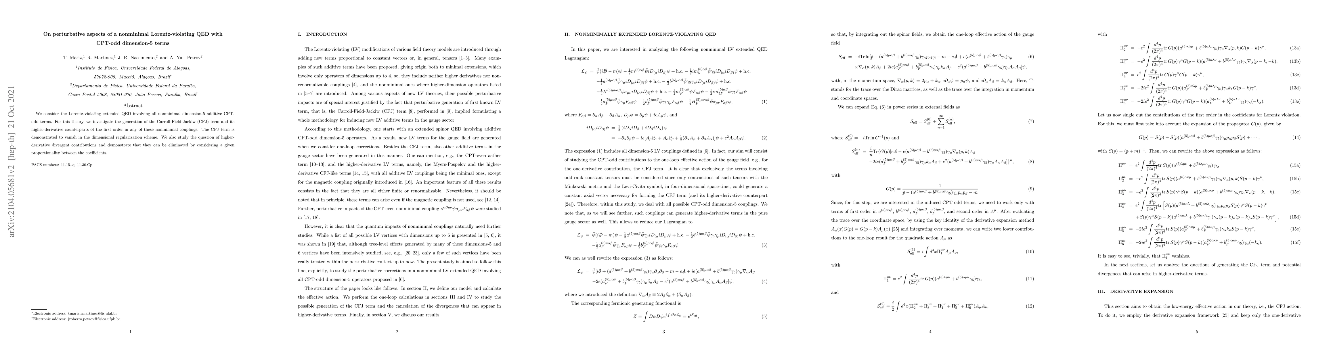 This paper investigates a Lorentz-violating extended QED with nonminimal CPT-odd dimension-5 terms, finding that the Carroll-Field-Jackiw term vanishes under specific regularization schemes, and demonstrates the elimination of higher-derivative divergent contributions through a particular coefficient relationship.