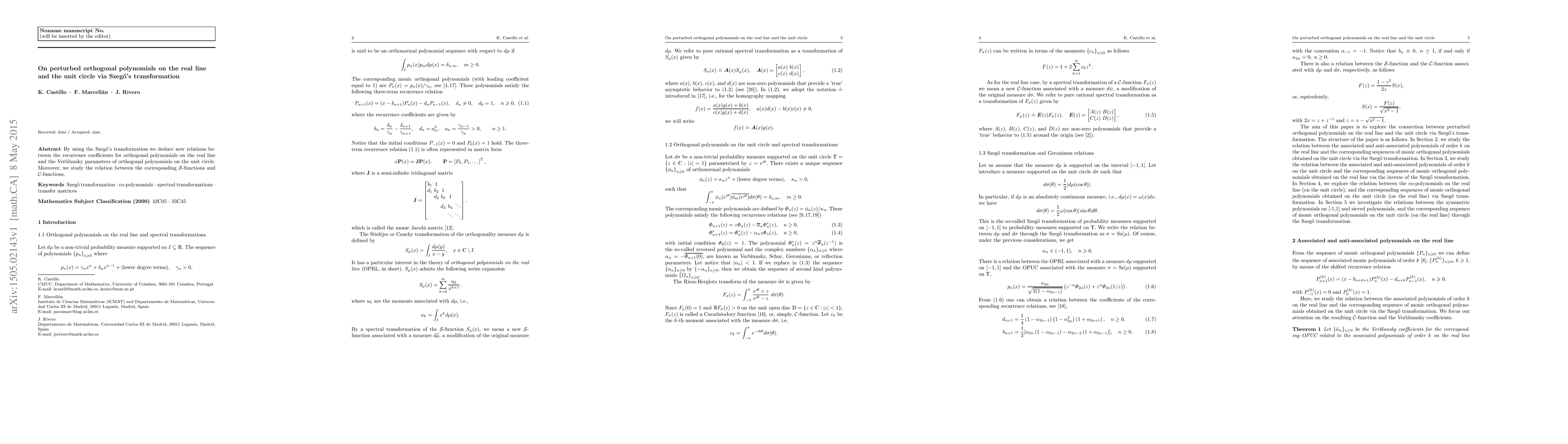 By using the Szeg\H{o}'s transformation we deduce new relations between the recurrence coefficients for orthogonal polynomials on the real line and the Verblunsky parameters of orthogonal polynomials on the unit circle. Moreover, we study the relation between the corresponding $\mathcal{S}$-functions and $\mathcal{C}$-functions