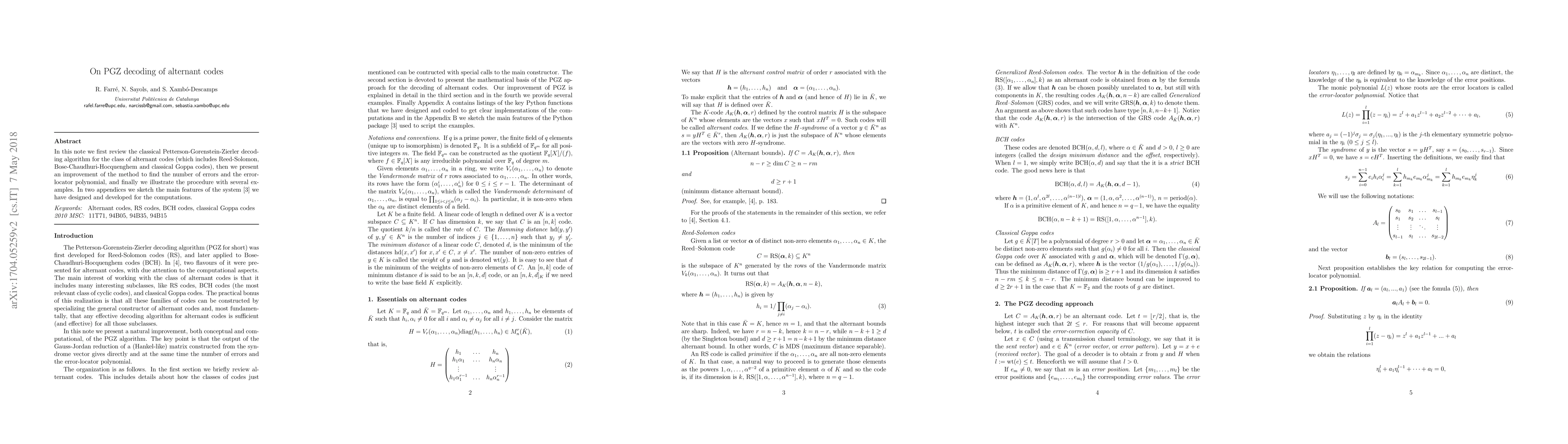 In this note we first review the classical Petterson-Gorenstein-Zierler decoding algorithm for the class of alternant codes (which includes Reed-Solomon, Bose-Chaudhuri-Hocquenghem and classical Goppa codes), then we present an improvement of the method to find the number of errors and the errorlocator polynomial, and finally we illustrate the procedure with several examples. In two appendices we sketch the main features of the system we have used for the computations.