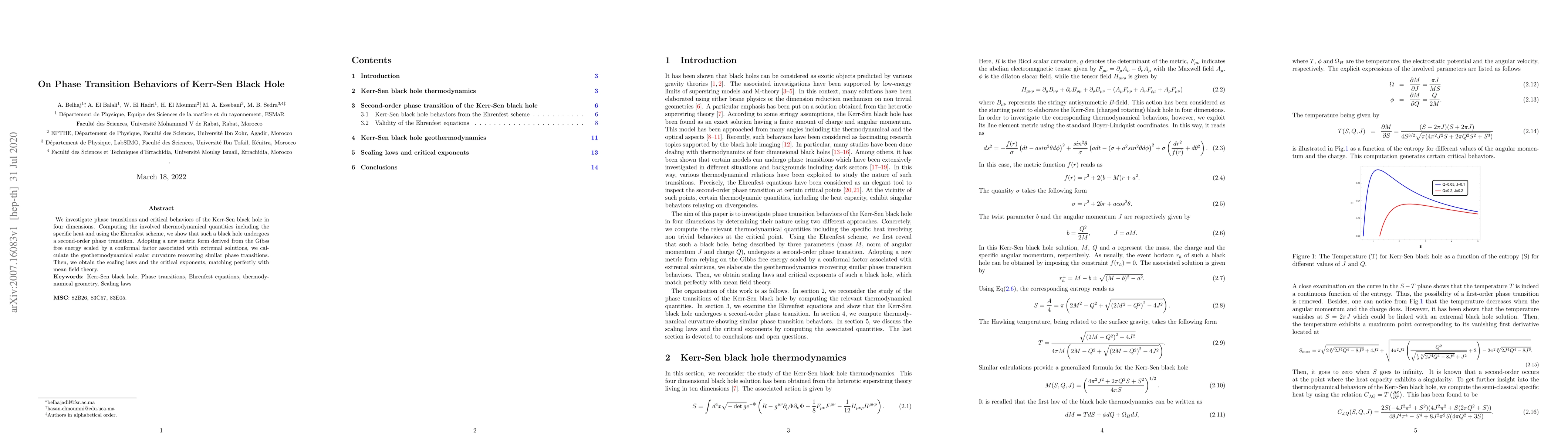 The research investigates phase transitions and critical behaviors of the Kerr-Sen black hole in four dimensions using thermodynamical quantities and the Ehrenfest scheme, confirming a second-order phase transition.
