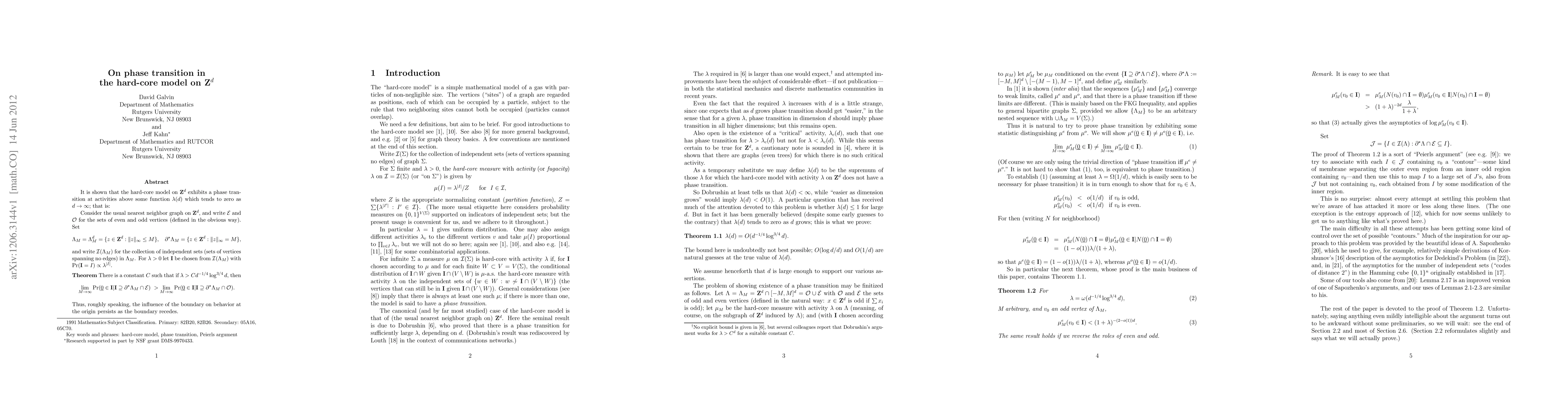 Summary: The hard-core model on ${\bf Z}^d$ demonstrates a phase transition at activity levels exceeding a function $\lambda(d)$, which diminishes as the dimension $d$ approaches infinity. This indicates a critical behavior in the model's configurational properties.