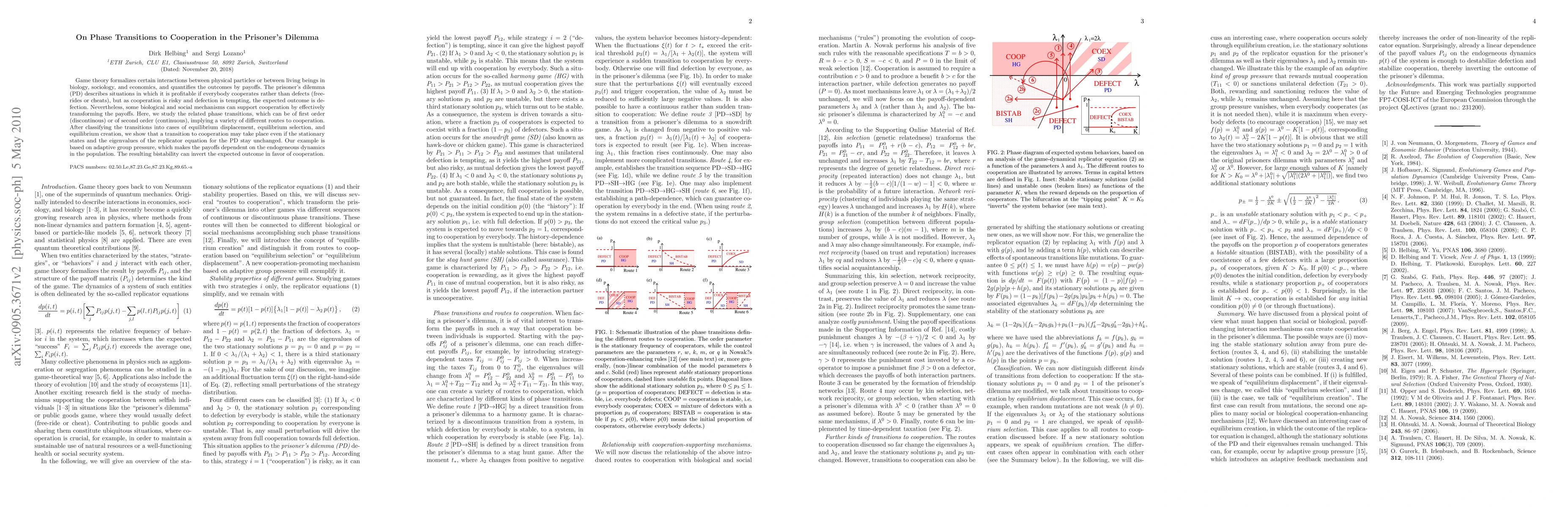 Game theory formalizes certain interactions between physical particles or between living beings in biology, sociology, and economics, and quantifies the outcomes by payoffs. The prisoner's dilemma (PD) describes situations in which it is profitable if everybody cooperates rather than defects (free-rides or cheats), but as cooperation is risky and defection is tempting, the expected outcome is defection. Nevertheless, some biological and social mechanisms can support cooperation by effectively transforming the payoffs. Here, we study the related phase transitions, which can be of first order (discontinous) or of second order (continuous), implying a variety of different routes to cooperation. After classifying the transitions into cases of equilibrium displacement, equilibrium selection, and equilibrium creation, we show that a transition to cooperation may take place even if the stationary states and the eigenvalues of the replicator equation for the PD stay unchanged. Our example is based on adaptive group pressure, which makes the payoffs dependent on the endogeneous dynamics in the population. The resulting bistability can invert the expected outcome in favor of cooperation.
