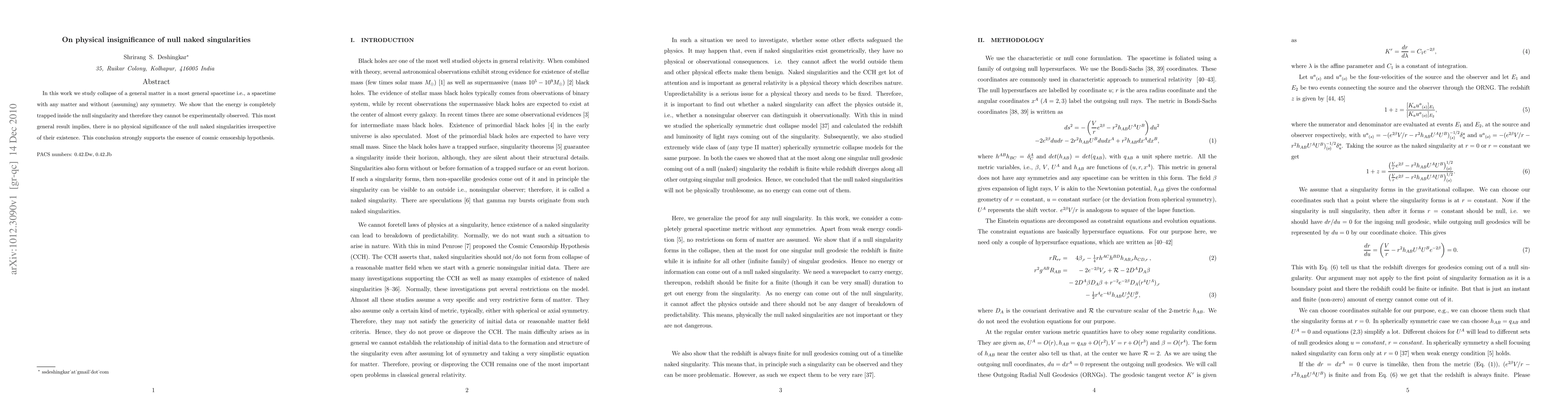 In this work we study collapse of a general matter in a most general spacetime i.e., a spacetime with any matter and without (assuming) any symmetry. We show that the energy is completely trapped inside the null singularity and therefore they cannot be experimentally observed. This most general result implies, there is no physical significance of the null naked singularities irrespective of their existence. This conclusion strongly supports the essence of cosmic censorship hypothesis.