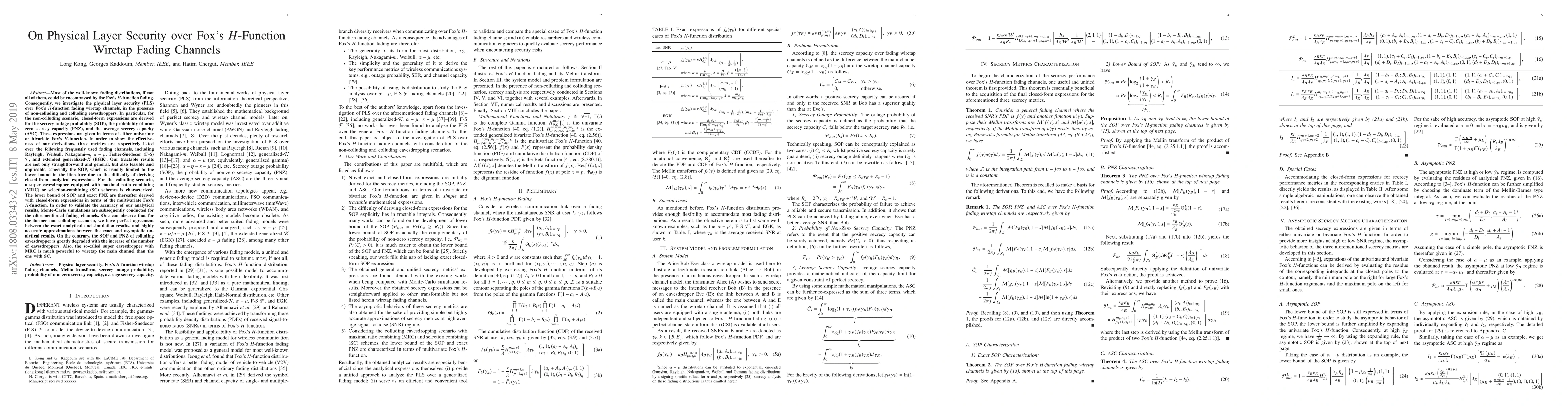 Most of the well-known fading distributions, if not all of them, could be encompassed by Fox's $H$-function fading. Consequently, we investigate the exact and asymptotic behavior of physical layer security (PLS) over Fox's $H$-function fading wiretap channels. In particular, closed-form expressions are derived for secrecy outage probability (SOP), probability of non-zero secrecy capacity (PNZ), and average secrecy capacity (ASC). These expressions are given in terms of either univariate or bivariate Fox's $H$-function. In order to show the comprehensive effectiveness of our derivations, three metrics are respectively listed over the following frequently used fading channels, including Rayleigh, Weibull, Nakagami-$m$, $\alpha-\mu$, Fisher-Snedecor (F-S) $\mathcal{F}$, and extended generalized-$\mathcal{K}$ (EGK). Our tractable results are more straightforward and general, besides that, they are feasible and applicable, especially the SOP, which was mostly limited to the lower bound in literature due to the difficulty of achieving closed-from expressions. In order to validate the accuracy of our analytical results, Monte-Carlo simulations are subsequently performed for the special case $\alpha-\mu$ fading channels. One can observe perfect agreements between the exact analytical and simulation results, and highly accurate approximations between the exact and asymptotic analytical results.