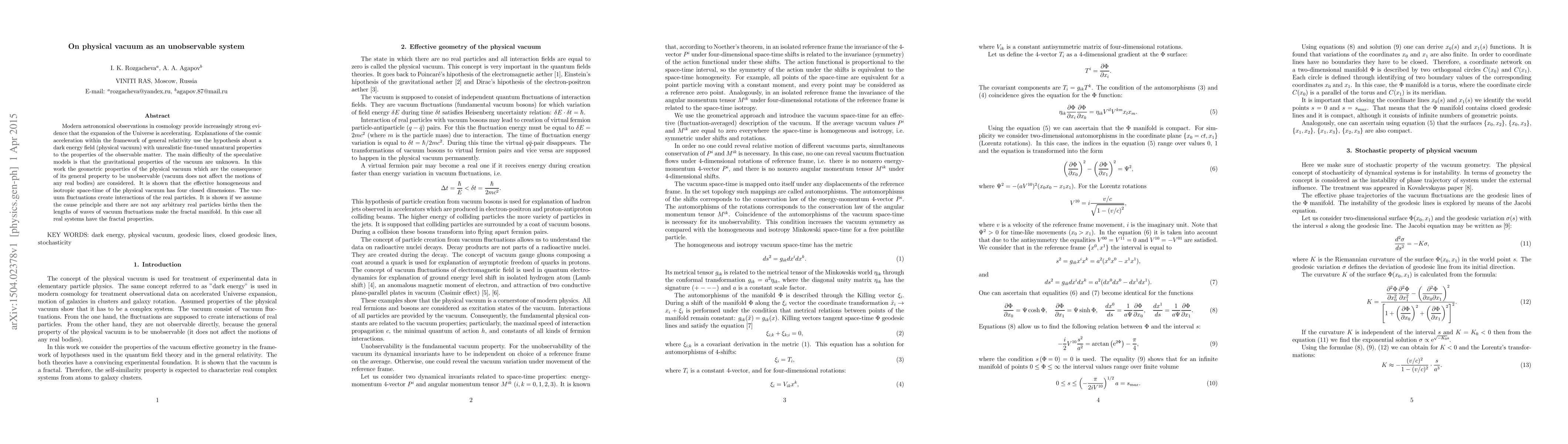 Modern astronomical observations in cosmology provide increasingly strong evidence that the expansion of the Universe is accelerating. Explanations of the cosmic acceleration within the framework of general relativity use the hypothesis about a dark energy field (physical vacuum) with unrealistic fine-tuned unnatural properties to the properties of the observable matter. The main difficulty of the speculative models is that the gravitational properties of the vacuum are unknown. In this work the geometric properties of the physical vacuum which are the consequence of its general property to be unobservable (vacuum does not affect the motions of any real bodies) are considered. It is shown that the effective homogeneous and isotropic space-time of the physical vacuum has four closed dimensions. The vacuum fluctuations create interactions of the real particles. It is shown if we assume the cause principle and there are not any arbitrary real particles births then the lengths of waves of vacuum fluctuations make the fractal manifold. In this case all real systems have the fractal properties.