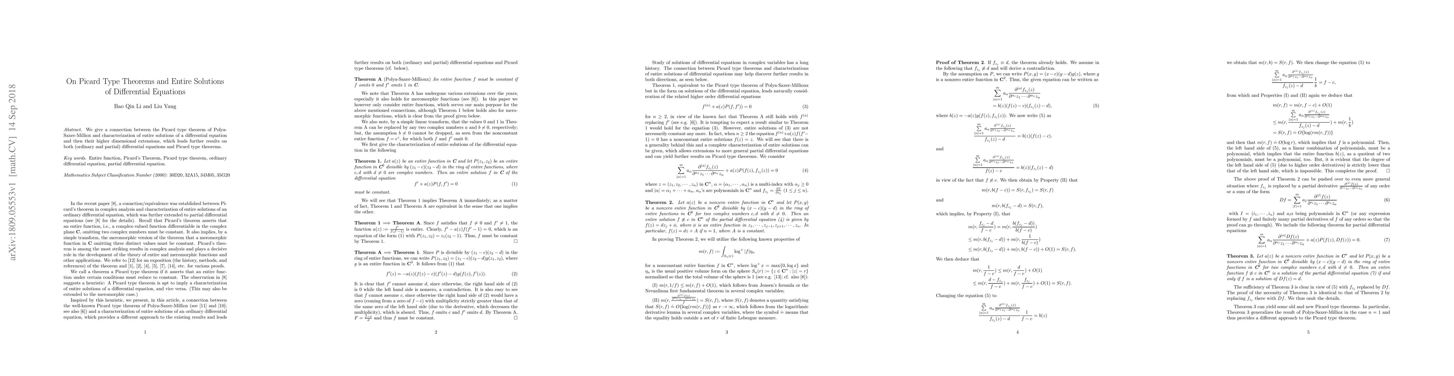 This paper establishes a link between the Picard type theorem and the characterization of entire solutions to differential equations, extending these findings to higher dimensions and deriving further results on both ordinary and partial differential equations.