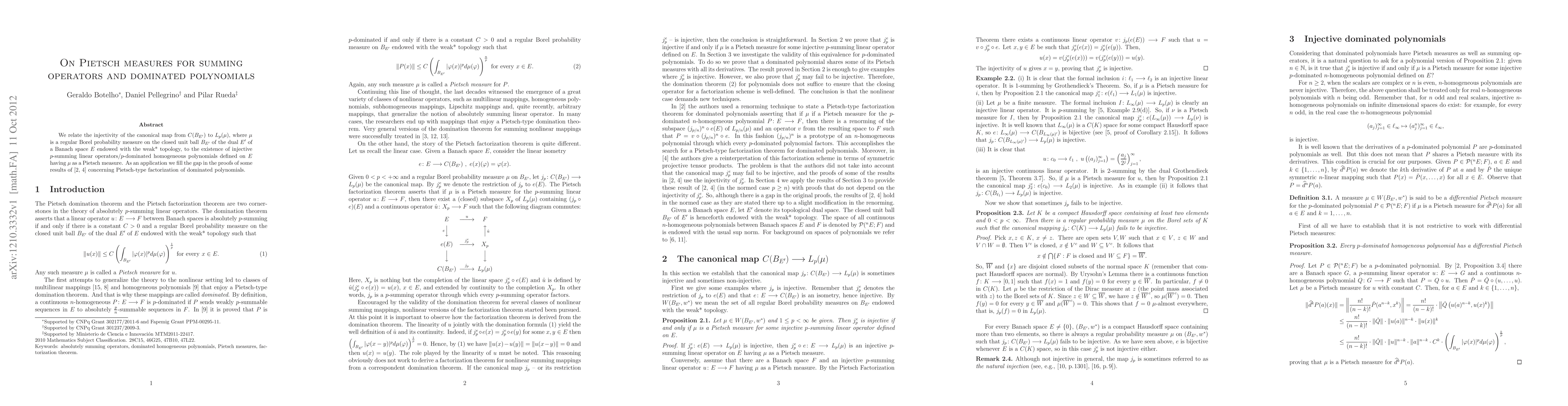 We relate the injectivity of the canonical map from $C(B_{E'})$ to $L_p(\mu)$, where $\mu$ is a regular Borel probability measure on the closed unit ball $B_{E'}$ of the dual $E'$ of a Banach space $E$ endowed with the weak* topology, to the existence of injective $p$-summing linear operators/$p$-dominated homogeneous polynomials defined on $E$ having $\mu$ as a Pietsch measure. As an application we fill the gap in the proofs of some results of concerning Pietsch-type factorization of dominated polynomials.
