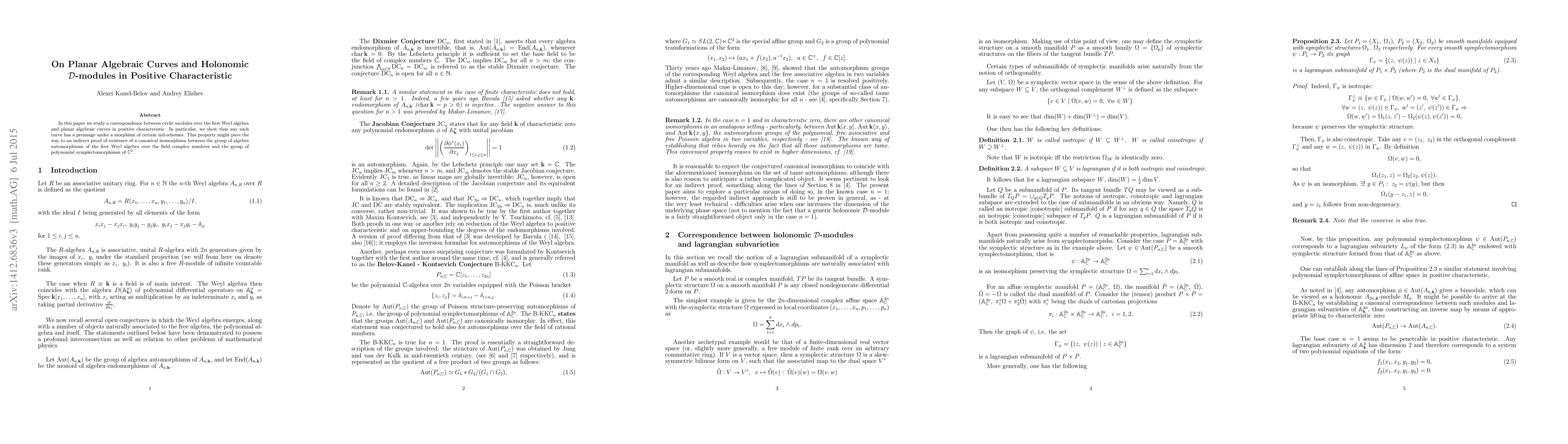This paper explores a connection between cyclic modules of the first Weyl algebra and planar algebraic curves in positive characteristic, demonstrating a morphism to ind-schemes. This could potentially provide an indirect proof for a canonical isomorphism between algebra automorphisms of the first Weyl algebra over complex numbers and polynomial symplectomorphisms of $mathbb{C}^2$.