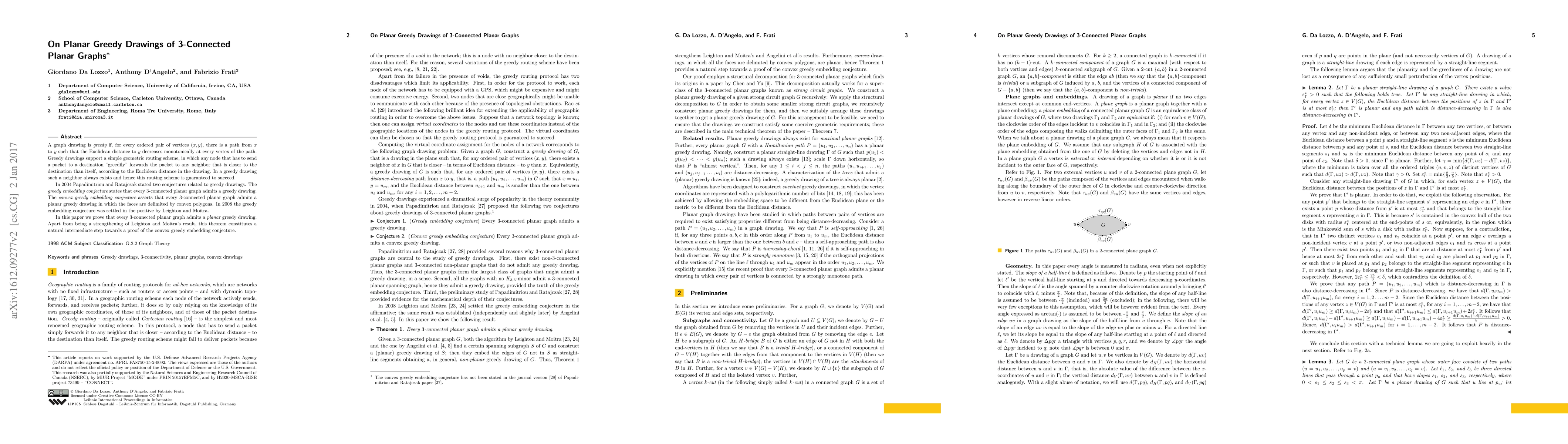 The paper introduces a novel inductive proof technique for constructing planar greedy drawings of 3-connected planar graphs, enhancing existing knowledge on geometric graph theory.