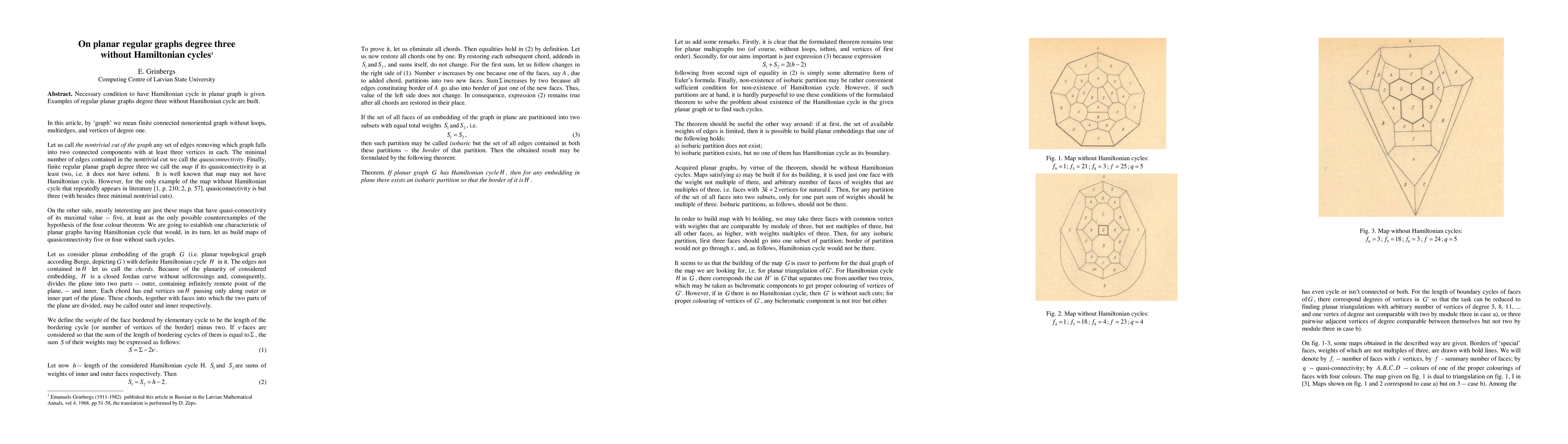 Summary: This paper establishes a necessary condition for planar graphs of degree three to possess Hamiltonian cycles and constructs examples of such regular planar graphs that lack Hamiltonian cycles.