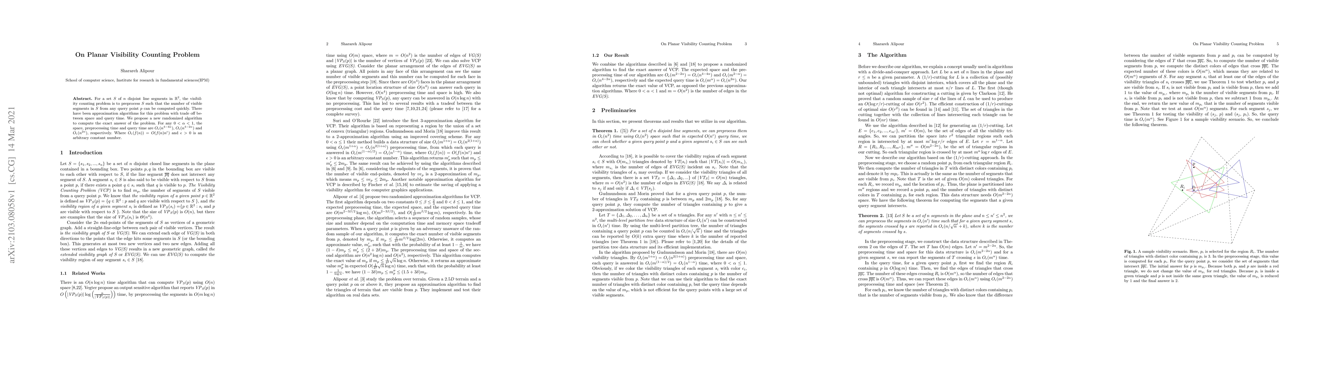 This paper proposes a new randomized algorithm for solving the planar visibility counting problem, achieving exact computation with space, preprocessing, and query times of $O_{\epsilon}(n^{4-4\alpha})$, $O_{\epsilon}(n^{4-2\alpha})$, and $O_{\epsilon}(n^{2\alpha})$, respectively, for $0<\alpha<1$. The algorithm balances these complexities effectively.
