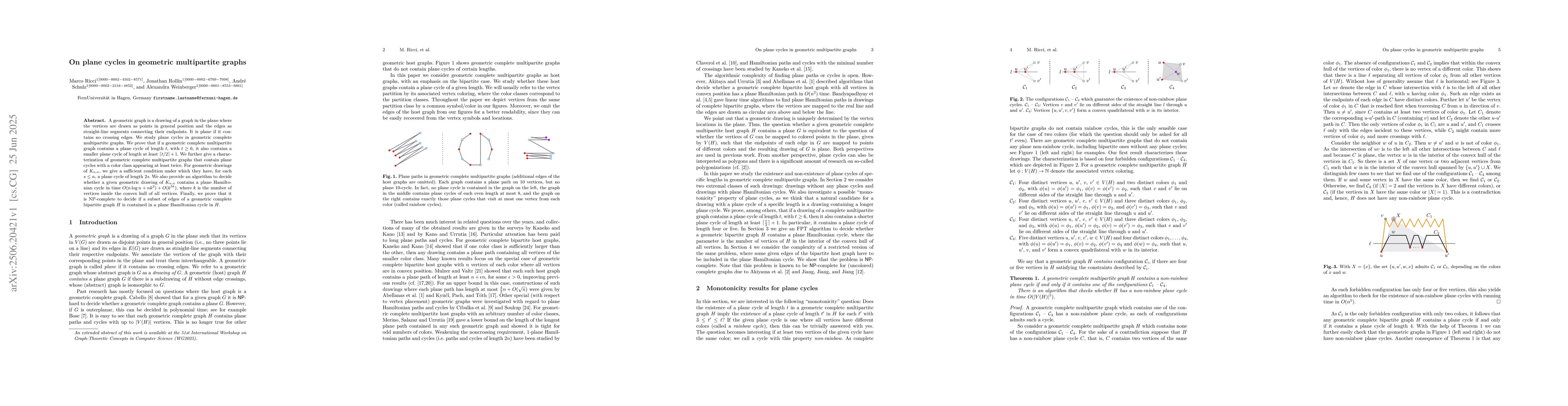 This research investigates plane cycles in geometric complete multipartite graphs, proving that longer cycles imply existence of smaller ones. It also offers characterizations, algorithms for detecting cycles in K_{n,n}, and complexity results for Hamiltonian cycle decisions in complete bipartite graphs.
