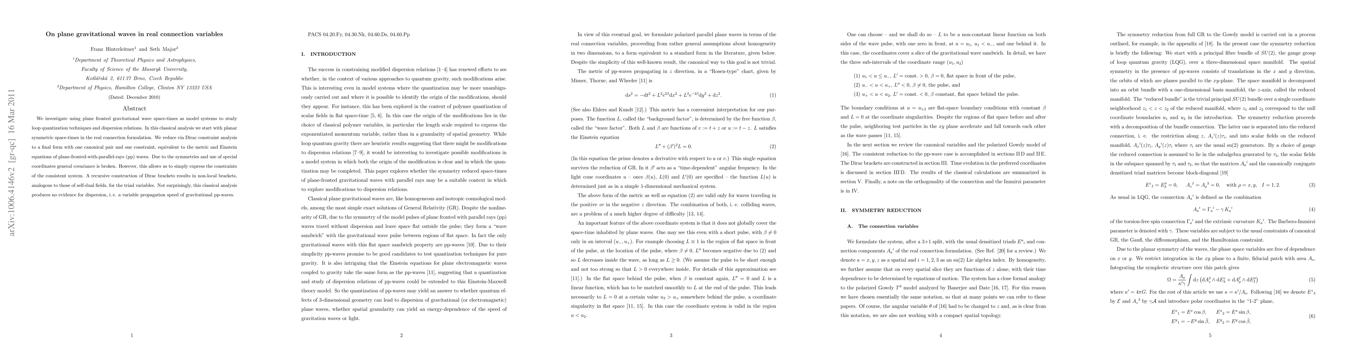 We investigate using plane fronted gravitational wave space-times as model systems to study loop quantization techniques and dispersion relations. In this classical analysis, we start with planar symmetric space-times in the real connection formulation. We reduce via Dirac constraint analysis to a final form with one canonical pair and one constraint, equivalent to the metric and Einstein equations of plane-fronted with parallel rays waves. Due to the symmetries and use of special coordinates general covariance is broken. However, this allows us to simply express the constraints of the consistent system. A recursive construction of Dirac brackets results in non-local brackets, analogous to those of self-dual fields, for the triad variables chosen in this approach.