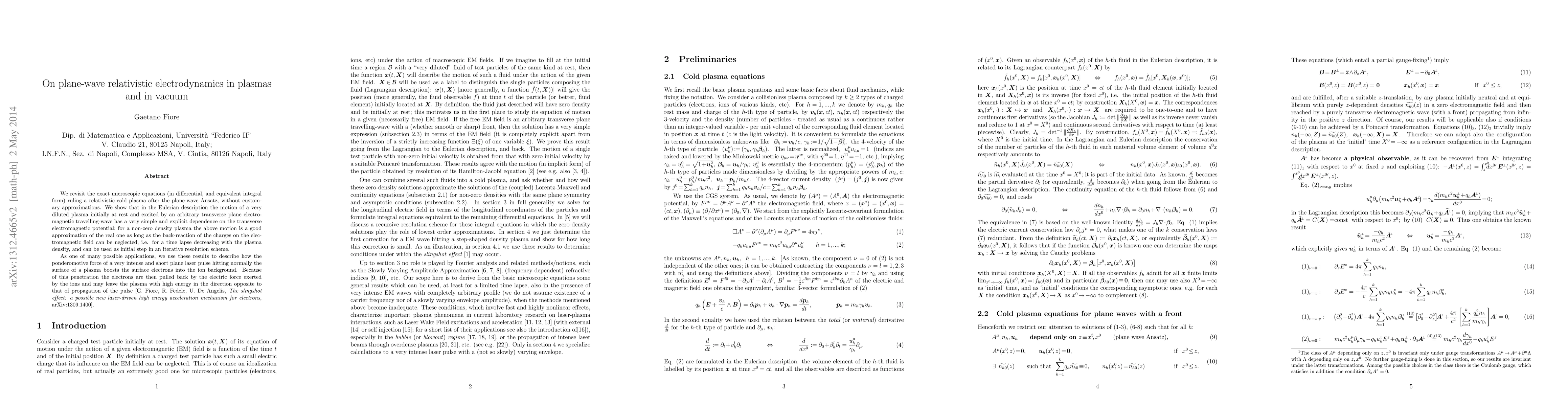 We revisit the exact microscopic equations (in differential, and equivalent integral form) ruling a relativistic cold plasma after the plane-wave Ansatz, without customary approximations. We show that in the Eulerian description the motion of a very diluted plasma initially at rest and excited by an arbitrary transverse plane electromagnetic travelling-wave has a very simple and explicit dependence on the transverse electromagnetic potential; for a non-zero density plasma the above motion is a good approximation of the real one as long as the back-reaction of the charges on the electromagnetic field can be neglected, i.e. for a time lapse decreasing with the plasma density, and can be used as initial step in an iterative resolution scheme. As one of many possible applications, we use these results to describe how the ponderomotive force of a very intense and short plane laser pulse hitting normally the surface of a plasma boosts the surface electrons into the ion background. Because of this penetration the electrons are then pulled back by the electric force exerted by the ions and may leave the plasma with high energy in the direction opposite to that of propagation of the pulse [G. Fiore, R. Fedele, U. De Angelis, "The slingshot effect: a possible new laser-driven high energy acceleration mechanism for electrons", arXiv:1309.1400].