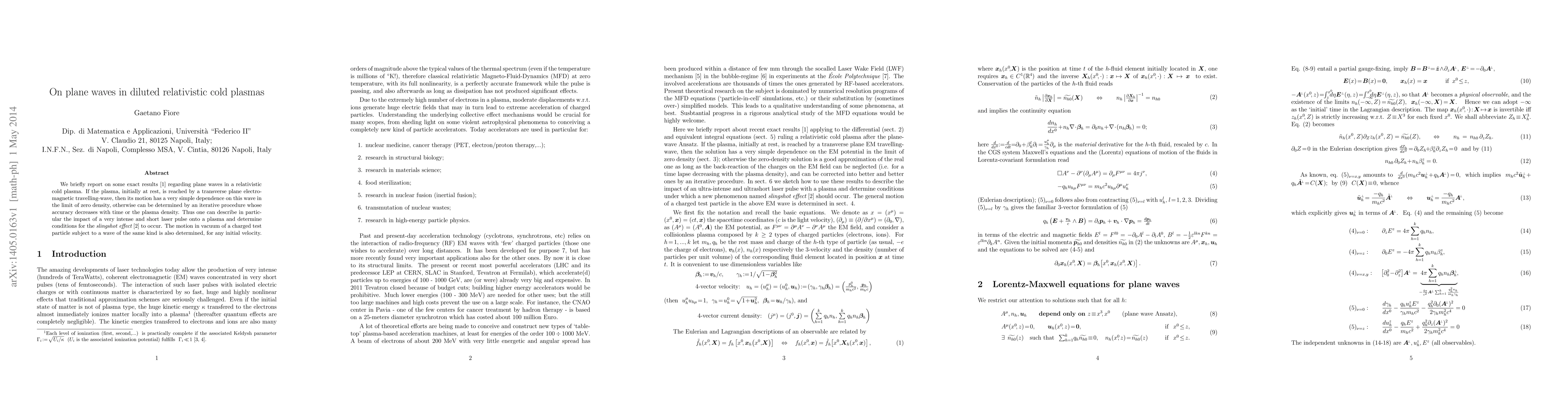We briefly report on some exact results [G. Fiore, arXiv:1312.4665 preprint, to appear in J. Phys. A] regarding plane waves in a relativistic cold plasma. If the plasma, initially at rest, is reached by a transverse plane electromagnetic travelling-wave, then its motion has a very simple dependence on this wave in the limit of zero density, otherwise can be determined by an iterative procedure whose accuracy decreases with time or the plasma density. Thus one can describe in particular the impact of a very intense and short laser pulse onto a plasma and determine conditions for the "slingshot effect" [G. Fiore, R. Fedele, U. De Angelis, arXiv:1309.1400 preprint] to occur. The motion in vacuum of a charged test particle subject to a wave of the same kind is also determined, for any initial velocity.